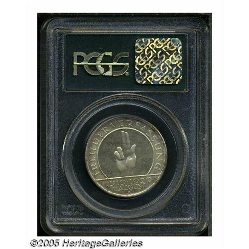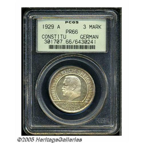 <B>Weimar Republic. Weimar Constitution 3 Mark 1929A,</B></I> KM63, Proof 66 PCGS. Cameo contrast with a bit deeper toning than the previous toning.