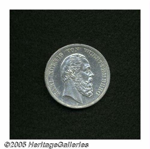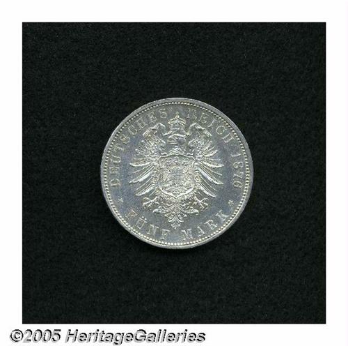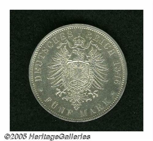 <B>Wurttemberg. Karl I 5 Mark 1876-F,</B></I> Bust right/Eagle, KM623, AU with a substantial amount of luster remaining. This type is very scarce in conditions of XF and above. From the Dr. Kurt Peters Collection.