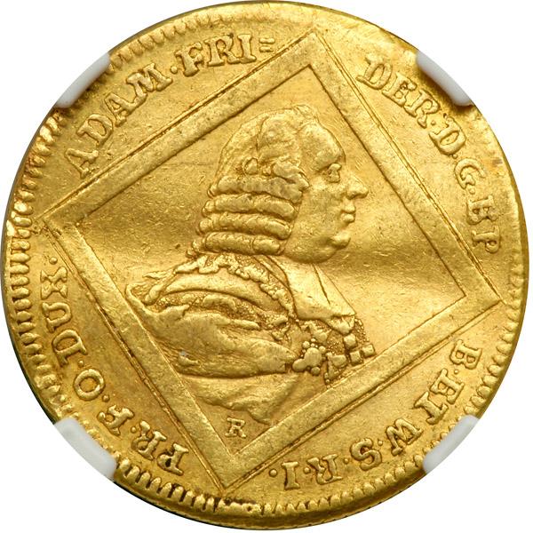 German States - Würzburg. Ducat, 1777. Fr-3725; KM-409. Adam Friedrich Von Seinsheim, 1755-1779. Bust in square. Reverse: Arms in square. Rim damage and bent. NGC graded Extremely Fine, Details.
