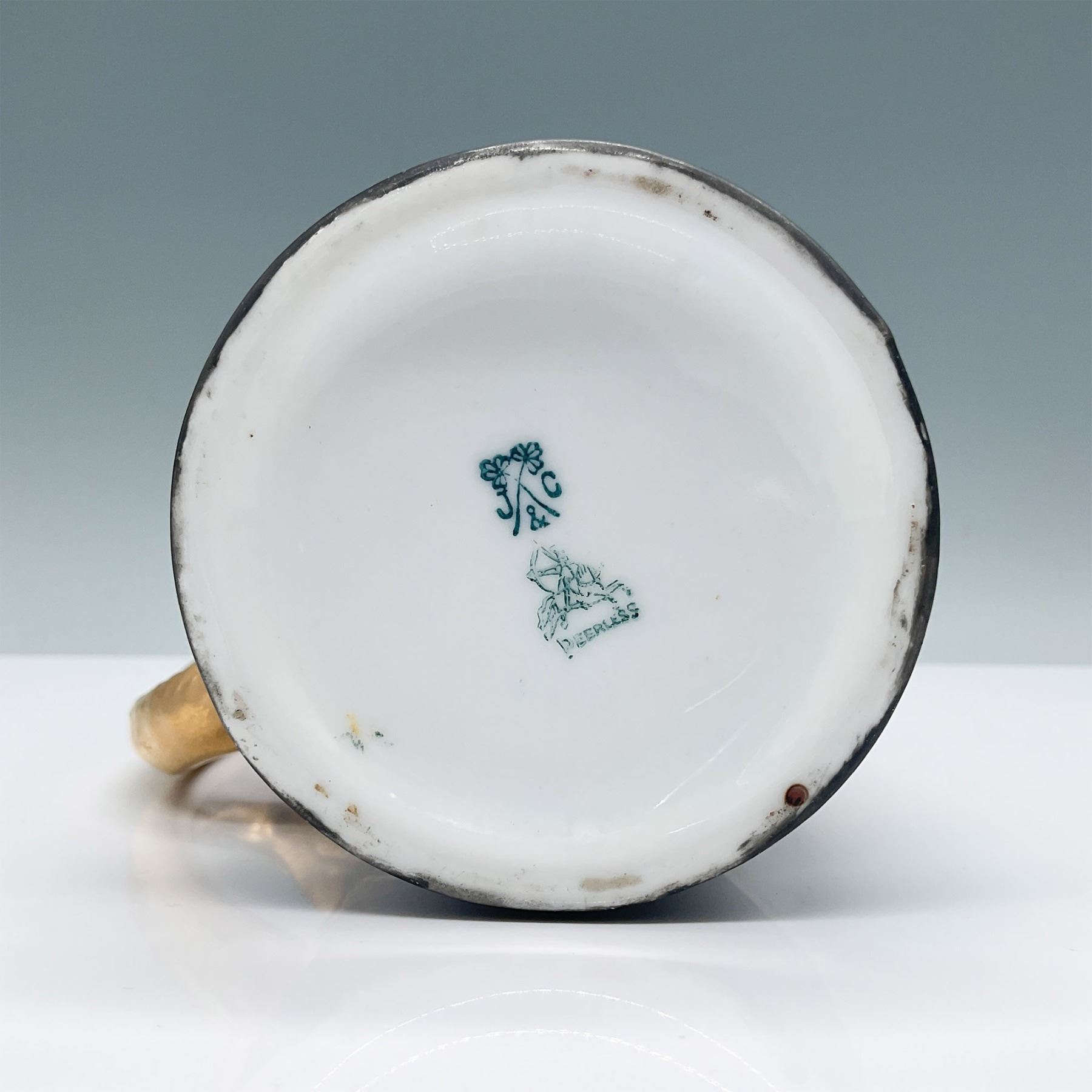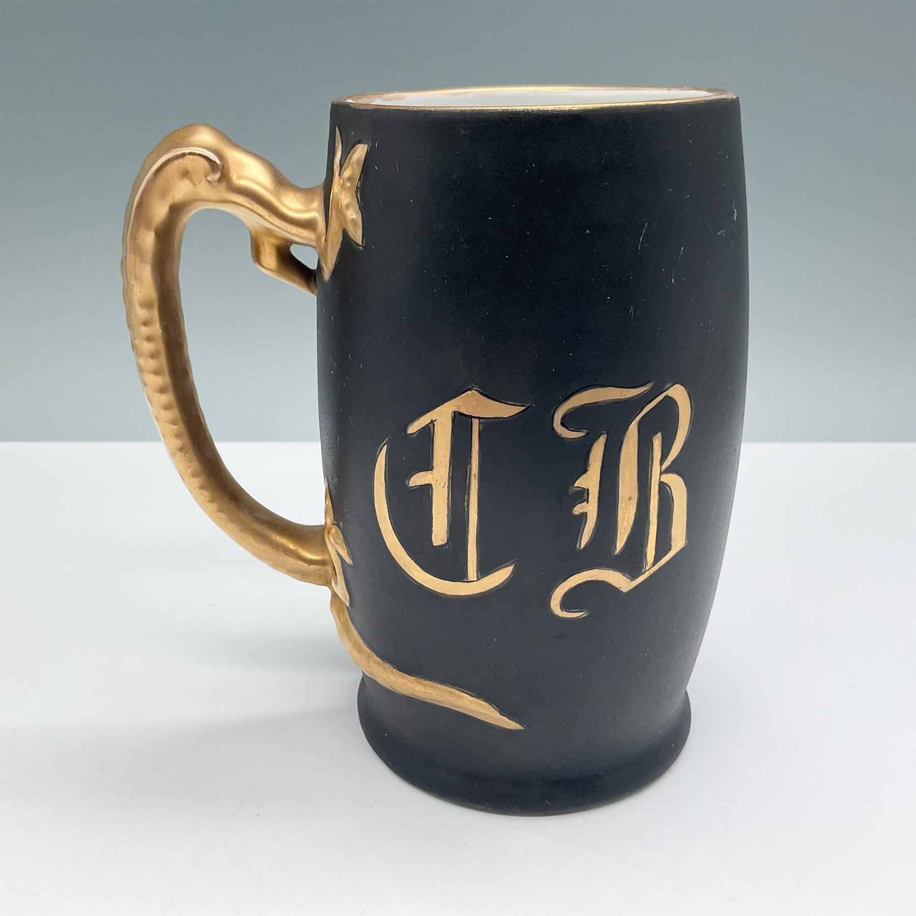 A vintage German stein mug featuring the Independent Order of Odd Fellows (IOOF) emblem with "F," "L," and "T" in gold, red, blue, and white shield design. Adorned with elegant gold accents, including an ornate dragon handle and initials "C B" in Gothic script. Marked on the bottom with "R C" and "Germany." Stands 5.75"H.