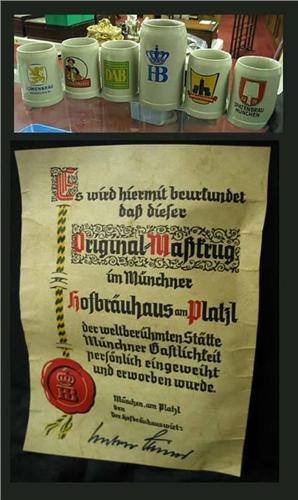 German Steins, five stand 5 1/8" tall 0.5 liter and one stands 7 1/2" tall 1 liter