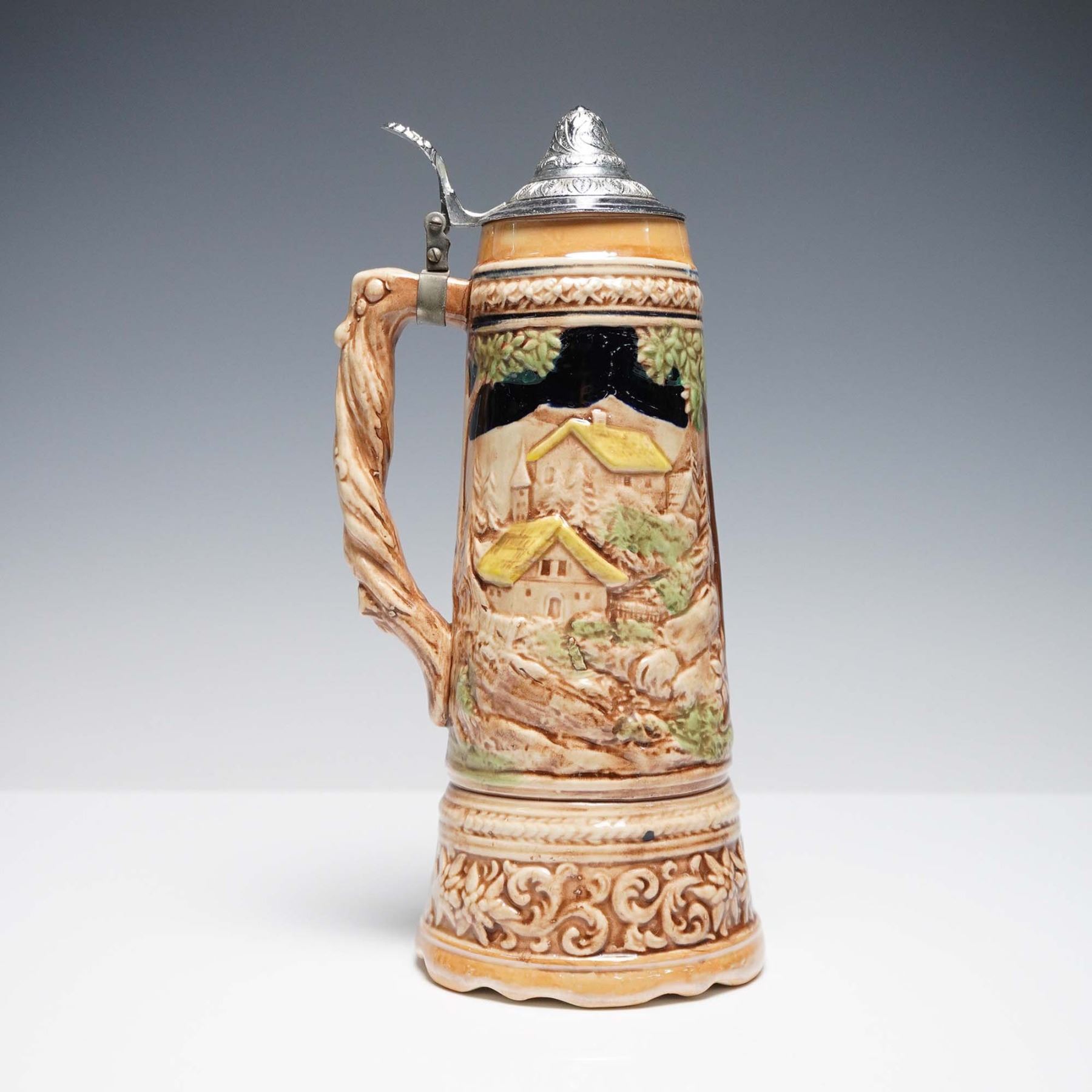 Vintage ceramic beer stein with a detailed raised-relief design featuring a traditional alpine scene on one side and a lively dancing couple on the other. The stein is finished in earthy tones with vibrant hand-painted highlights and a highly decorative handle molded in a twisting branch motif. Topped with a domed pewter lid featuring embossed foliate scrollwork and a decorative thumb lift.