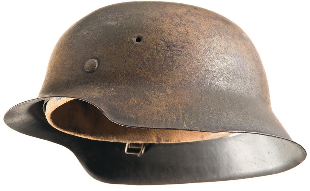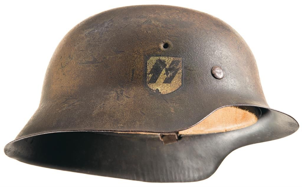 A wartime revision of the Model 1935, with the design refined for greater ease of manufacture. Originally finished in a dark green, a three-color tan, brown and green camouflage paint job applied, with care taken to preserve a silver and black SS shield decal on the right side of the helmet. The underside of the brim is faintly marked "Er66" and "56 5" and tan leather webbing. Helmet is good. A number of honest scuffs and scratches are present on the exterior, with a few areas of brown spotting. Some discoloration is visible on the decal. The chinstrap is absent and the cord slightly frayed, otherwise the webbing is good.