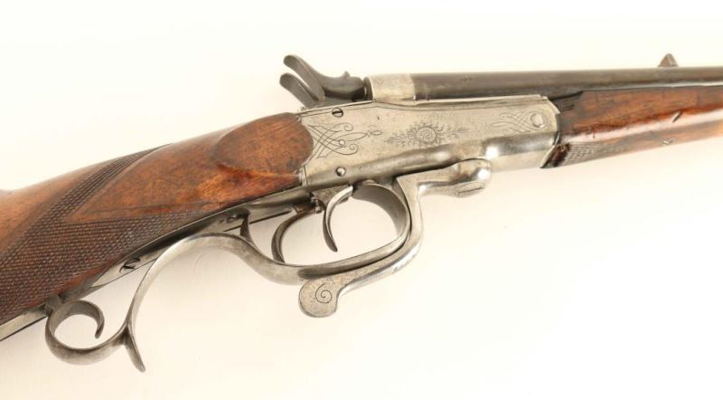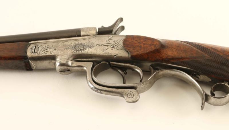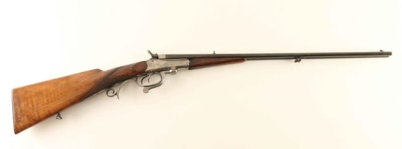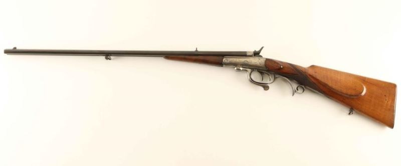 Exposed hammer break open side by side rifle/shotgun combination. Blued 24 1/2" barrels, nickel silver receiver, hand checkered stock, 1" sling mounts, and dual set triggers. NRA Very Good ***Antique Firearm***