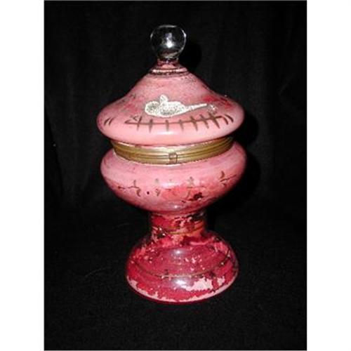 Unique C.1900 German glass footed tantalus is painted on the interior of glass with rose tone. As seen in the base part of the paint has worn away,yet could be restored by swirling paint in this area as the entire painted area is open as well as the lid interior. We rather liked the current look and left.Hand painting on the lid with raised bird,center. The delicate decanter is glass as well as the 6 shot glasses. A circular metal plate suspends them in the case. Heavy brass rim and latch on lid,base. Gilt trim on base. Measures 11H X 6W.