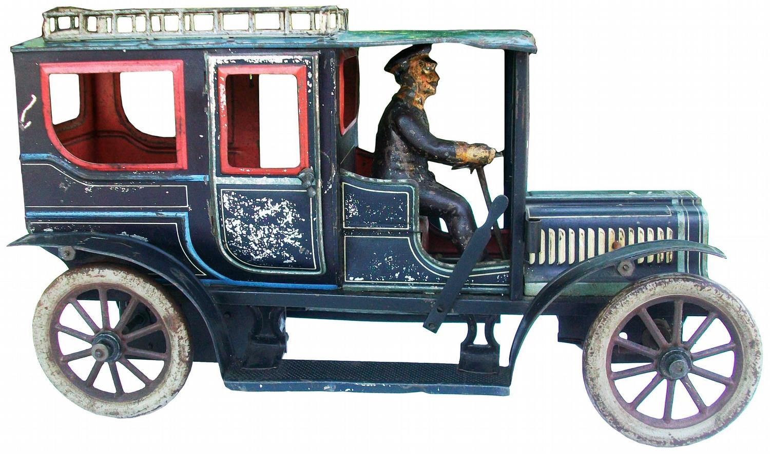 Carette Limosine Tin Wind Up Car, German. Missing one rear door and accessory lights otherwise very good original condition. 13 inches long.