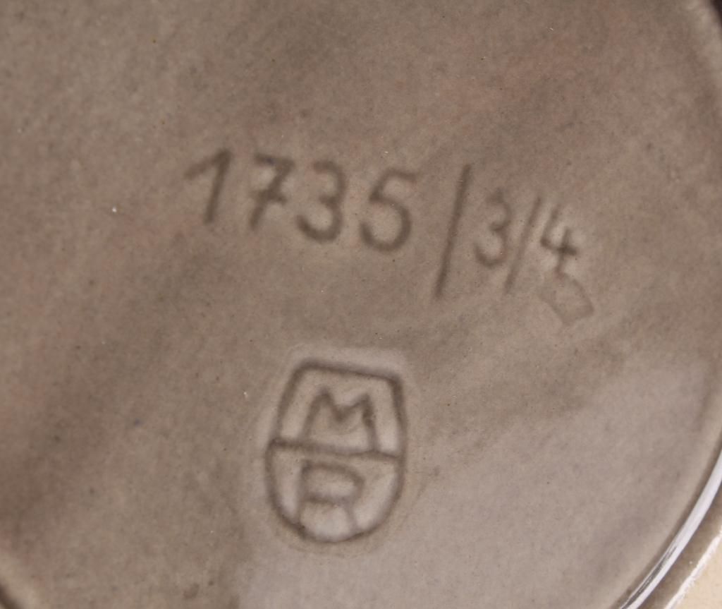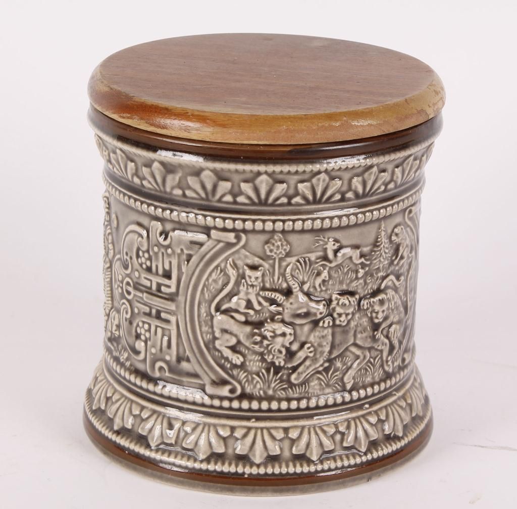 Built in humidity dispenser, marked made in Germany, "MR", oak lid, blue-grey glazed finish with hunting scenes.