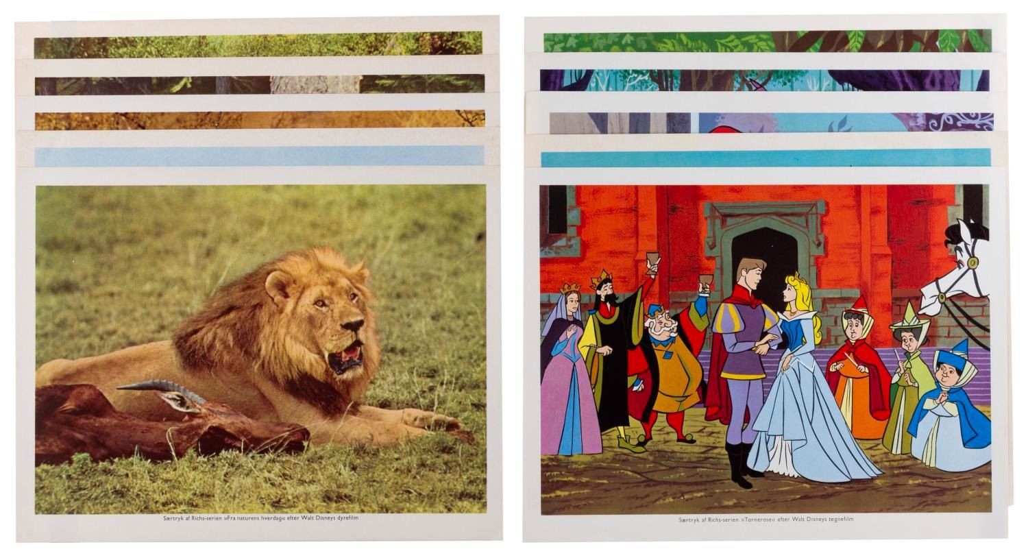 (Disney, 1960s-70s) A set of 10 German prints promoting"Sleeping Beauty" and"True Life Adventures." With five for each title, these appear to be lobby cards, but printed on very light paper. Measuring 7.75" x 10.25" each, the prints are in very good condition.