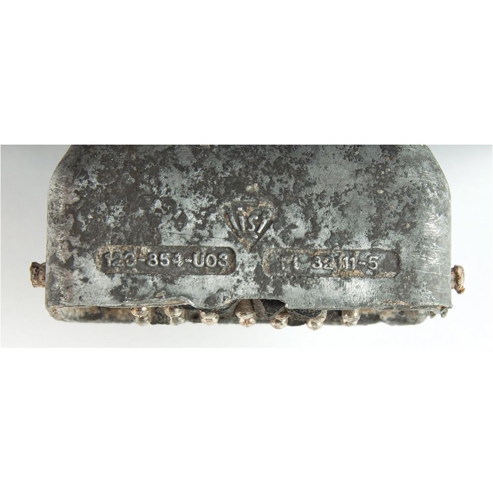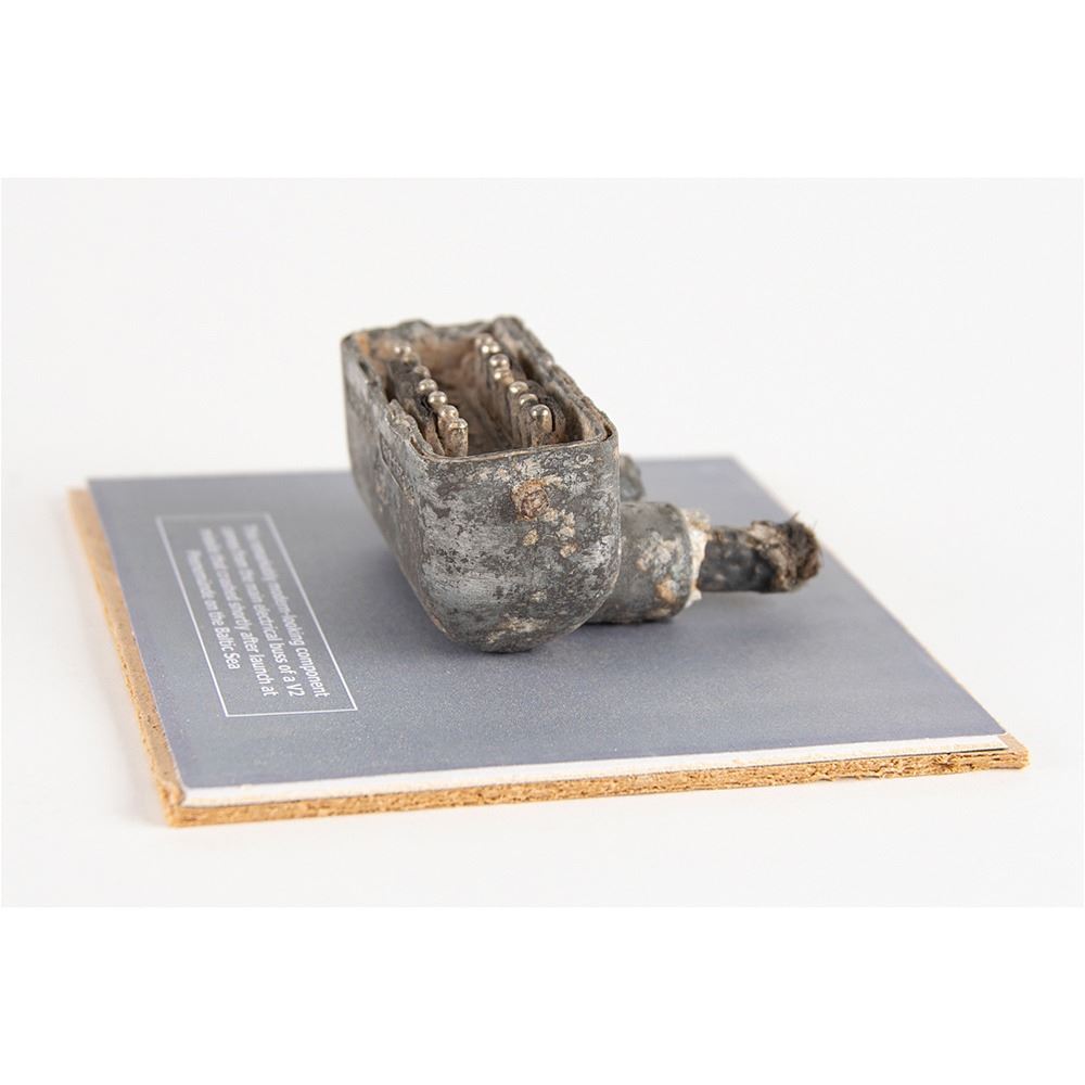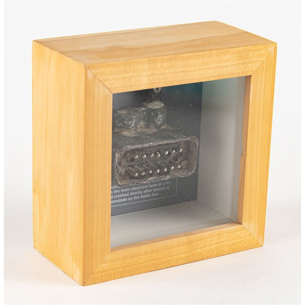 Flown electrical bus component recovered from a German V-2 rocket, measuring approximately 2.5è x 2.5è x 1.25è, mounted within in a shadowbox display with identification text: "This remarkably modern-looking component comes from the main electrical buss of a V2 missile that crashed shortly after launch at PeenemÌ_nde on the Baltic Sea." The shadowbox measures 5.5è x 5.5è x 2.75è.