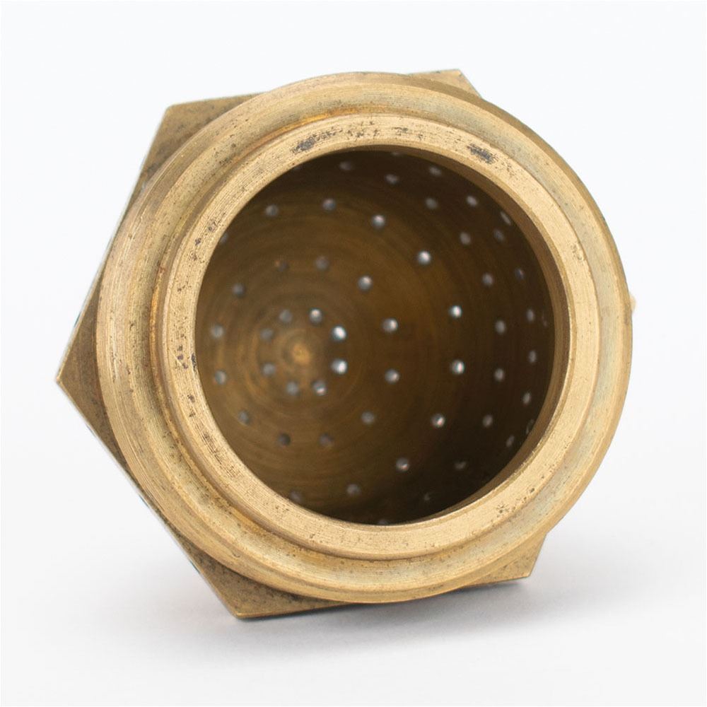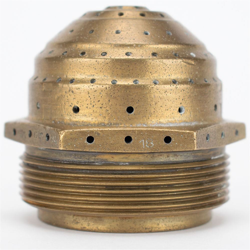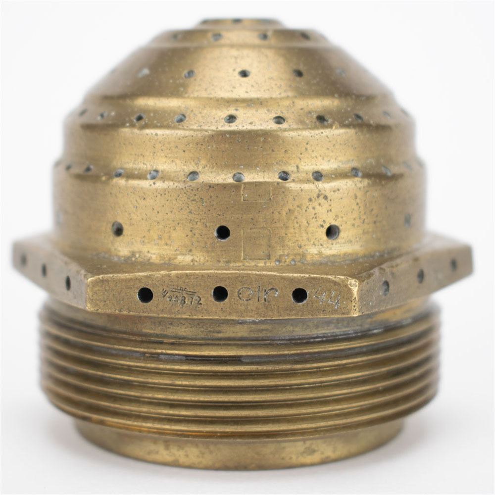 German V-2 Rocket Injector Head, measuring 2.5è in diameter and 2.25è tall, featuring a threaded connector and brass liquid oxygen (LOX) spray nozzle head. In the V-2, the alcohol fuel and liquid oxygen oxidizer were injected through brass nozzles and combustion initiated in 18 'burner cups' welded to the top of the combustion chamber.