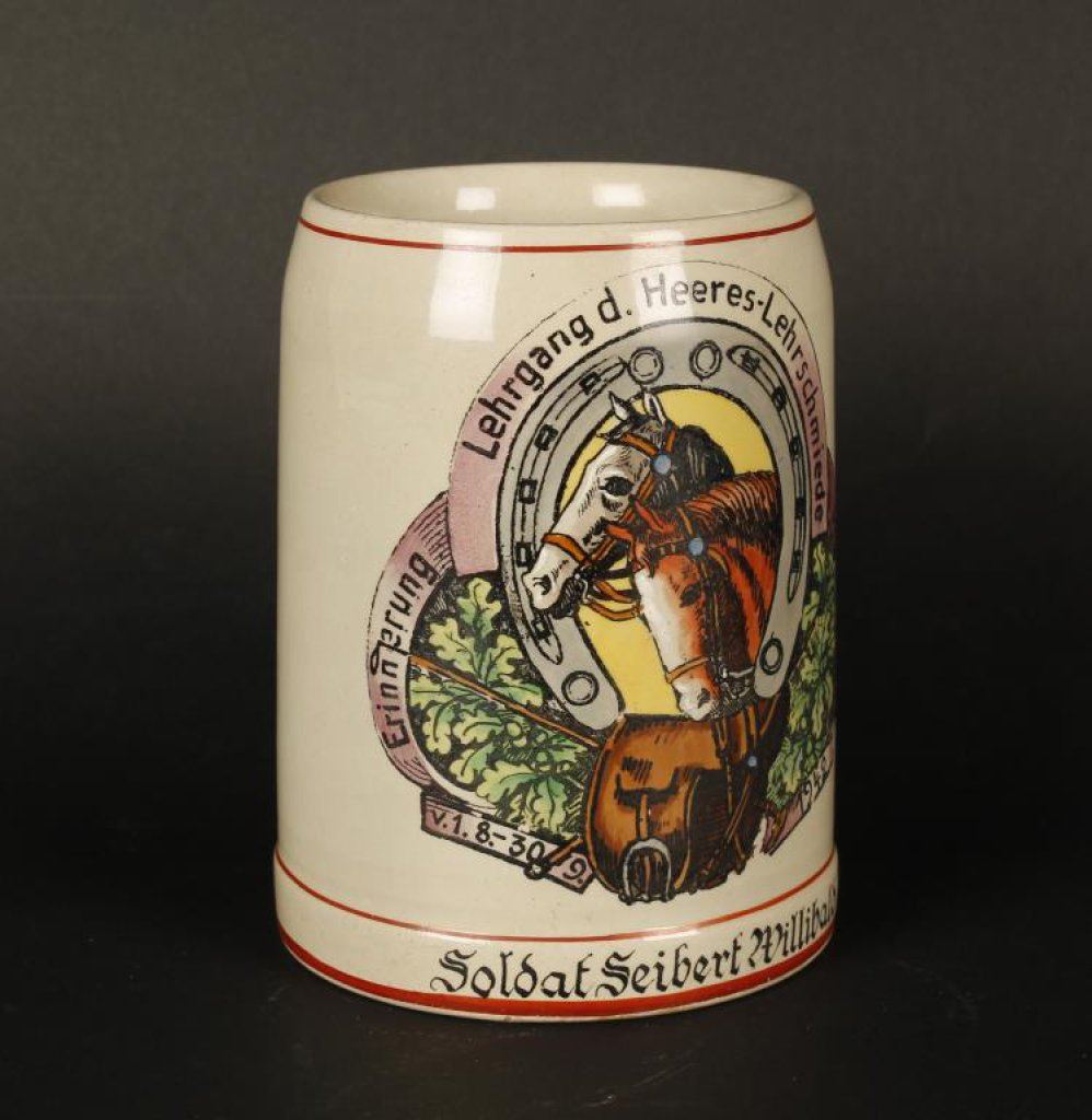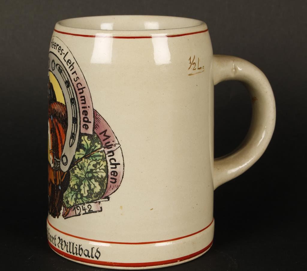 German WW II beer stein/mug; Army Cavalry School; named to Soldat Seibert Willibald; dated 1942. Est.: $125-$250.