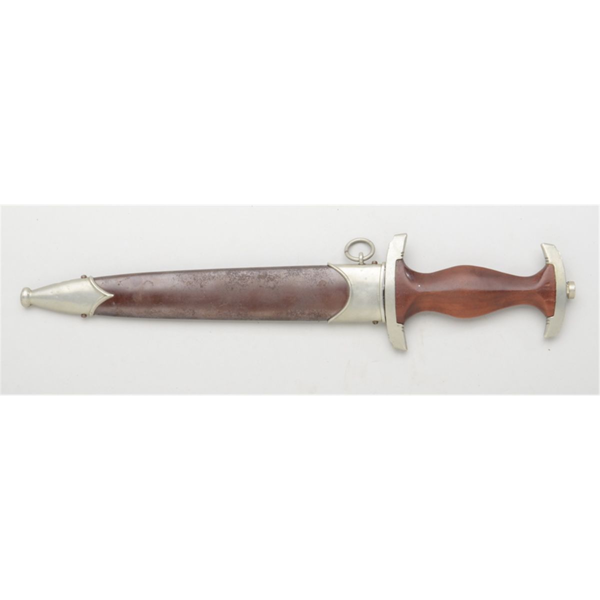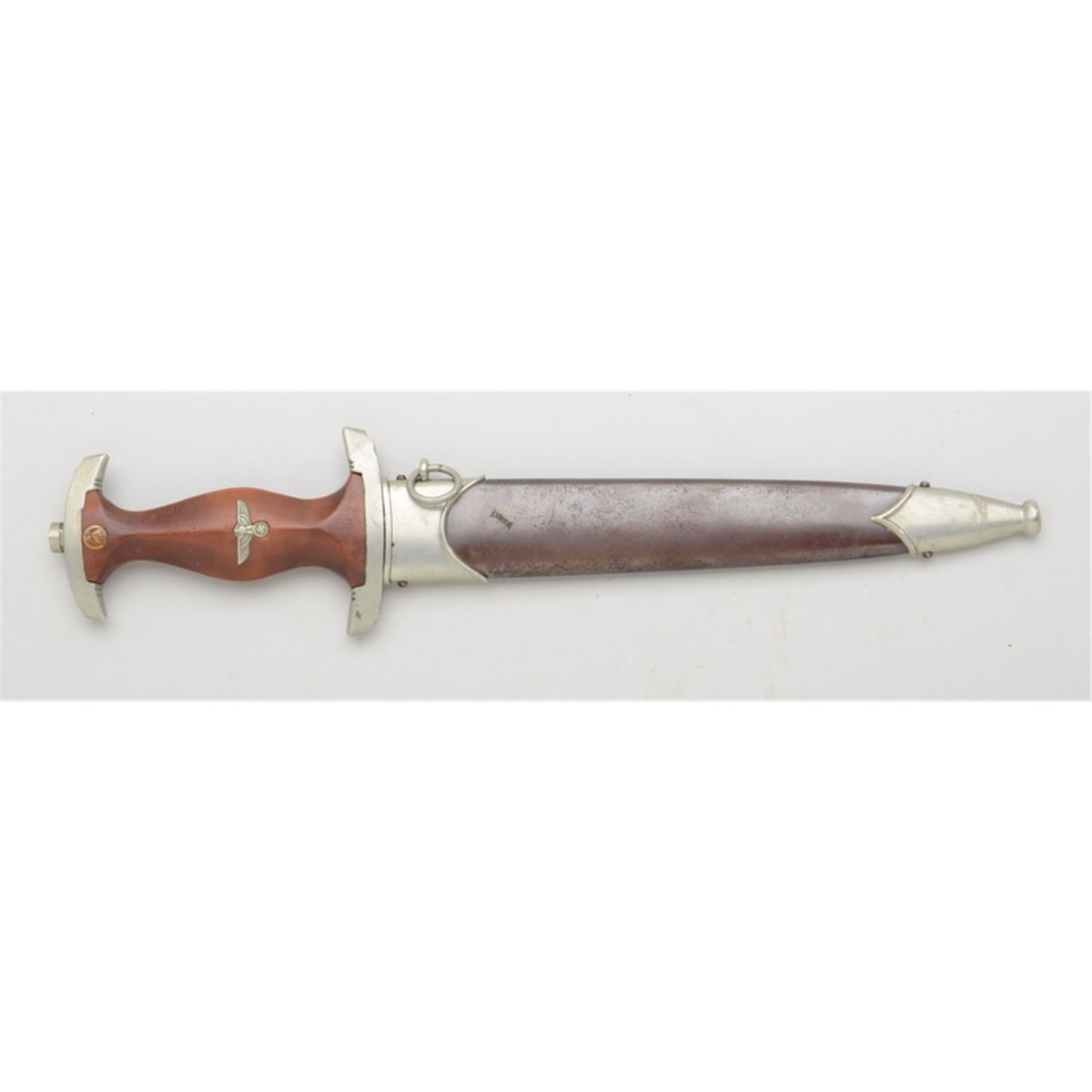 German WW II era SA dagger with etched blade by Carl Eickhorn in overall very good condition showing the standard etched blade, wood grip and metal sheath. Est.: $250-$500.