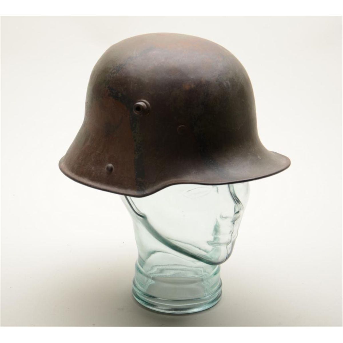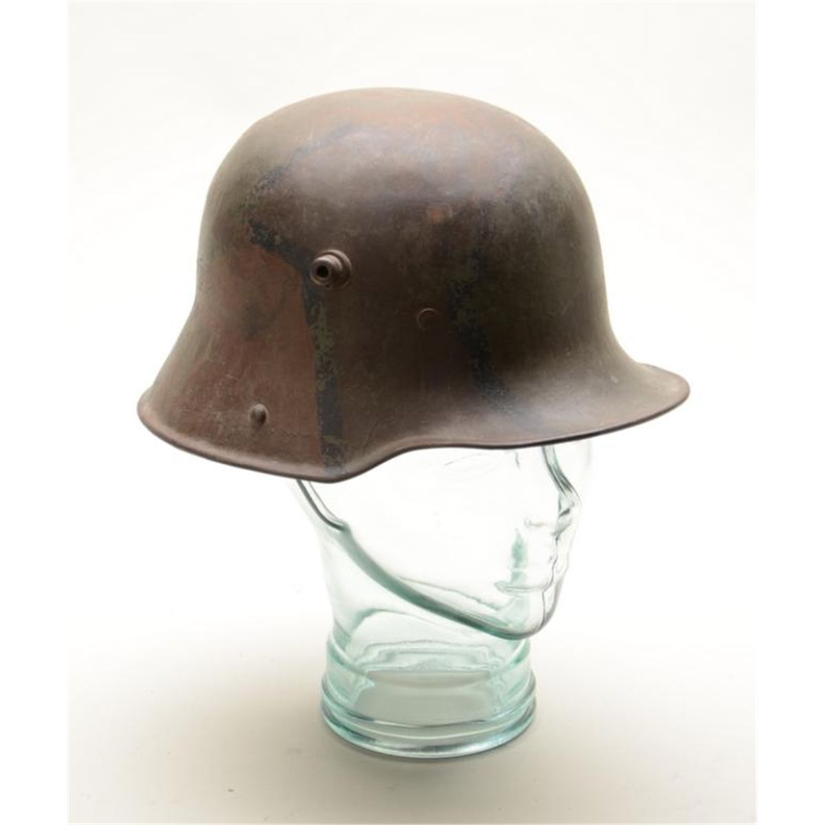 German WW II era metal helmet with old camo painting in overall uncleaned good condition; partial padding in liner at ears remaining. Est.: $250-$500.