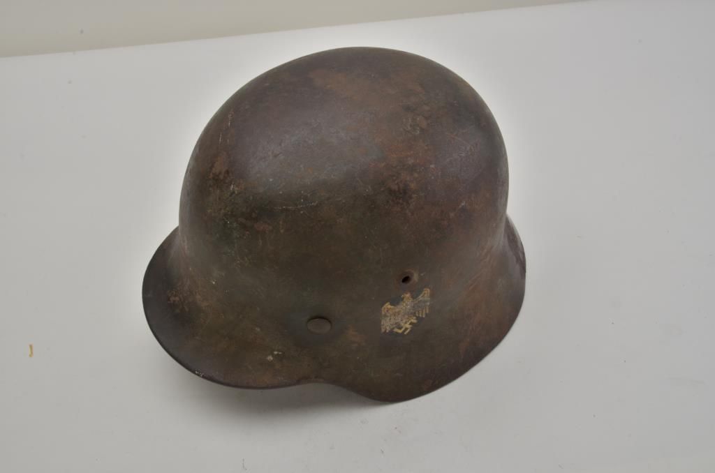 German WW II helmet, well-worn, uncleaned with liner and considerable remnants of spread eagle over swastika decal on left side of helmet; name “Braidl” inked twice inside on liner; chin strap also present. Est.:$300-$600.
