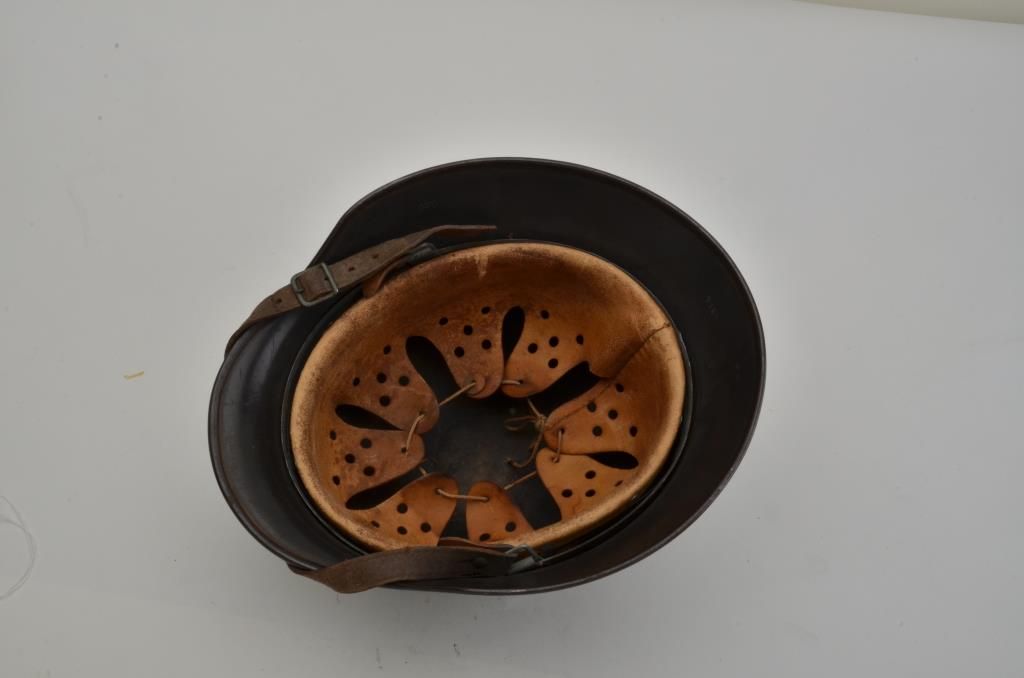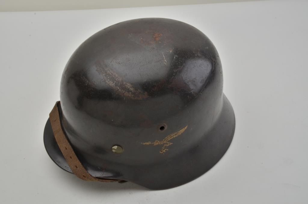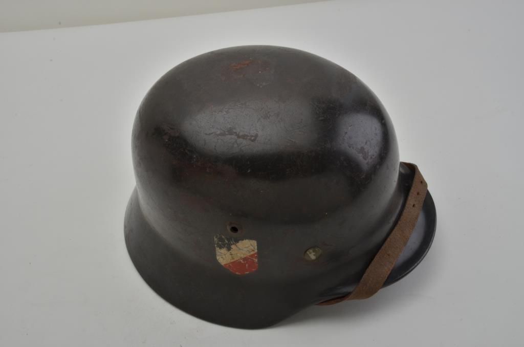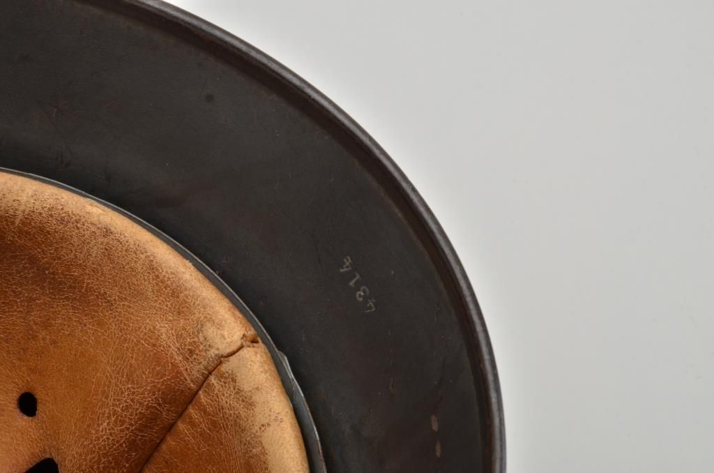 German WW II nazi era helmet showing dual decals and original liner and strap. The left side shows nazi eagle with swastika, right side shows black, white and red infantry shield. The body of the helmet shows approx.70% original paint with normal wear and losses. The exposed metal shows light pitting a patina. The inside of the helmet is marked “Q66” for size and numbered 4314 at back. The liner is good, the chin strap is goodwith normal leather age. Est.: $175-$350.