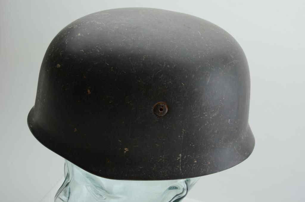 German WW II nazi paratrooper helmet with liner and chin strap in overall good un-cleaned condition showing old even wear and correct interior. Est.: $400-$800.