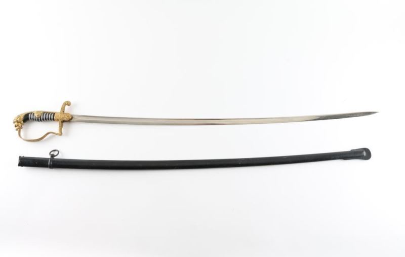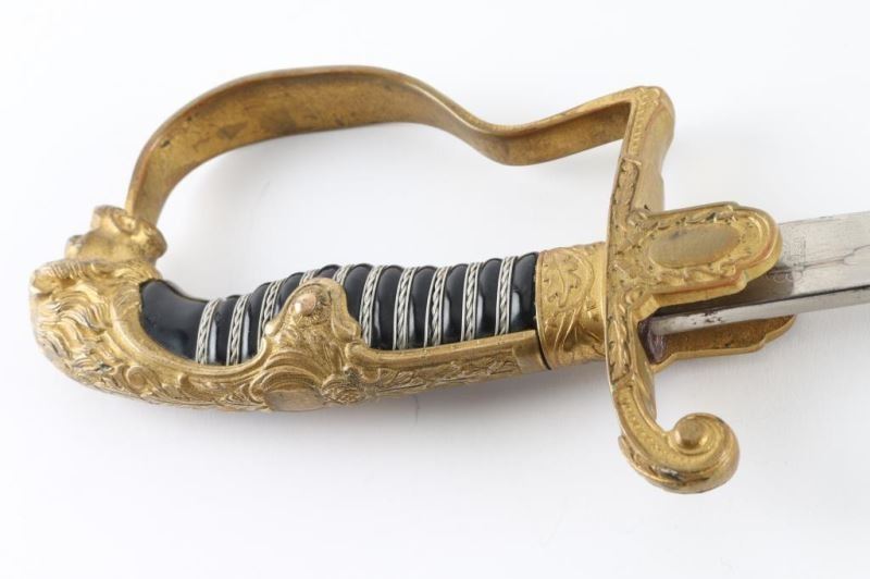 Eickhorn "Lions head" sword. Gilded ornate brass alloy pommel, backstrap, "P" handguard, and Eagle/Swastika crossguard. Lions head with faux ruby eyes. 32" curved bade is stamped with the Eickhorn trade mark with "Eickhorn Soligen". Leather washer in place. Blade is very good/bright. Triple wire wrapped grips are very good. Guild is very good. Single ring scabbard has been re-painted.
