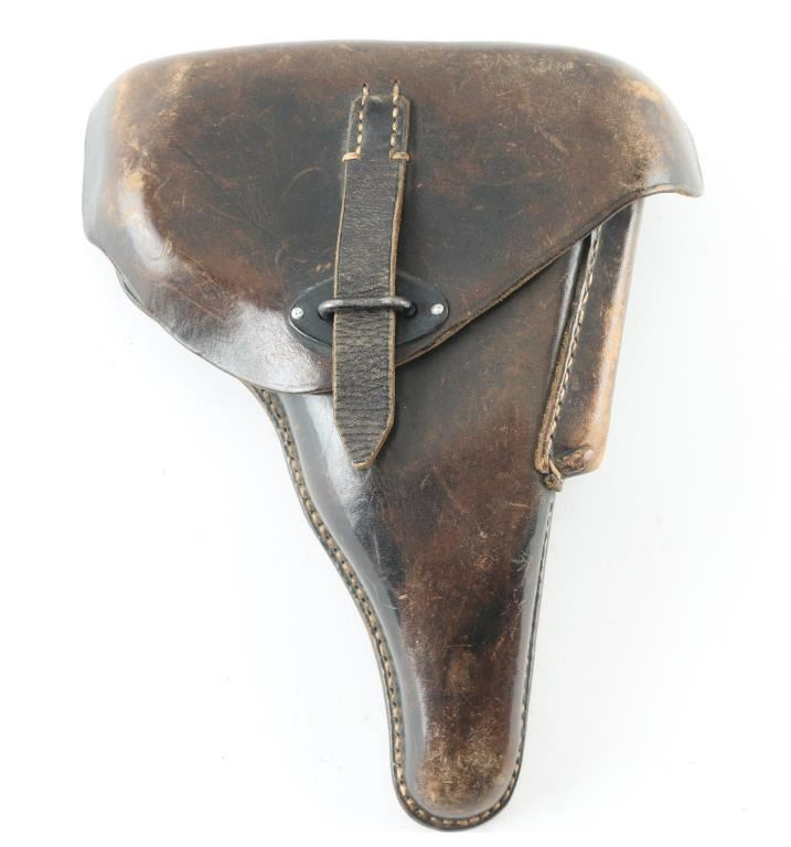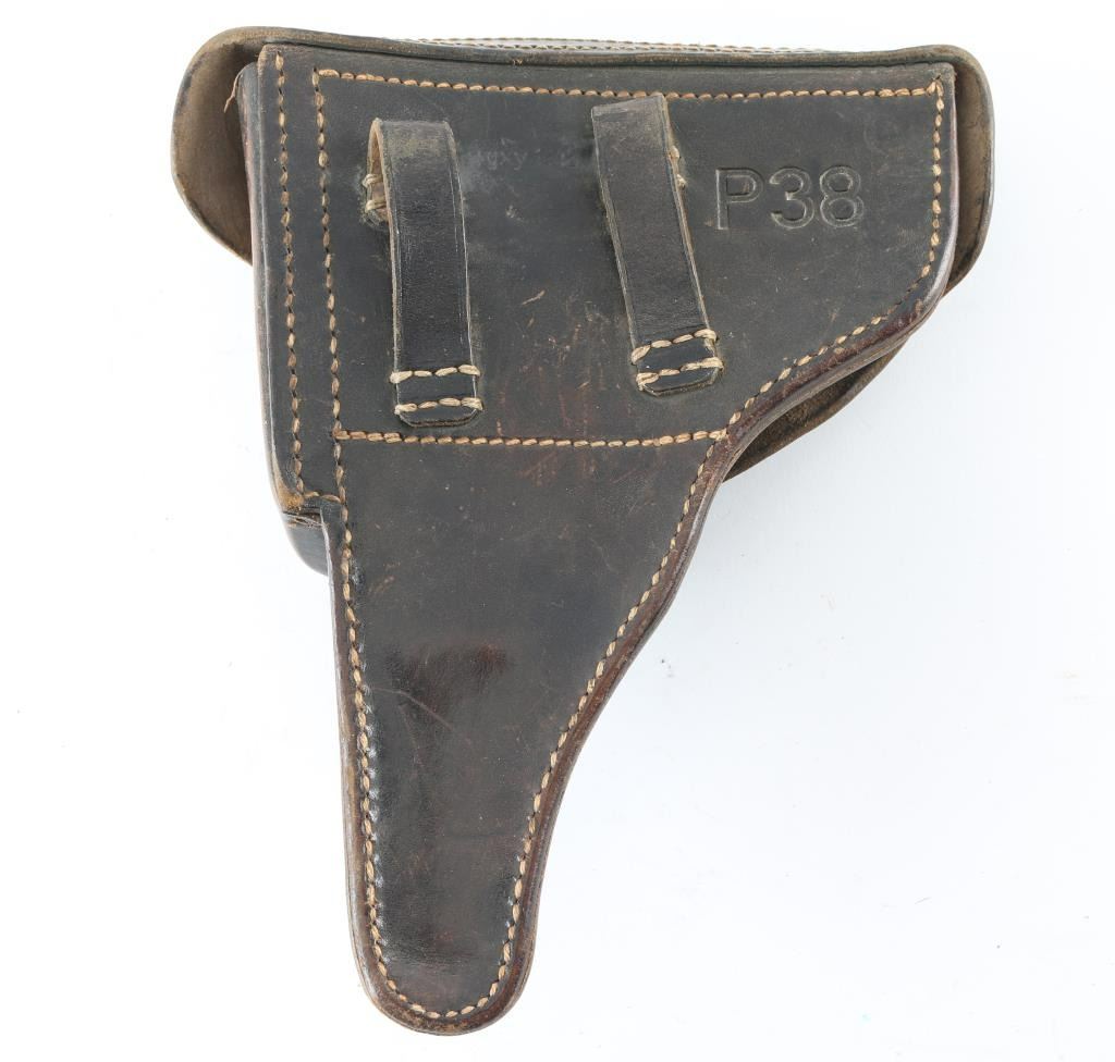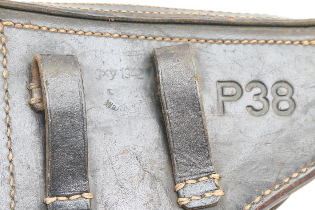 Third Reich era German Military holster for the P-38 Pistol. Hard shell. Black leather construction. Large "P.38" stamped on back, along with makers code "gxy", 1942 and waffenamt, Eagle over Wa xxx (numbers unreadable). Intact, good condition, scuffed.
