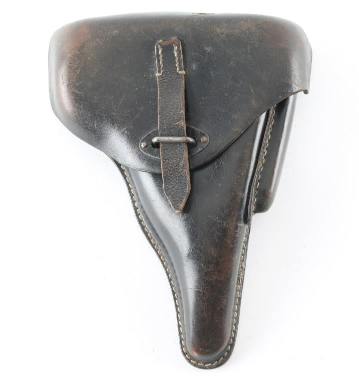 Third Reich era German Military/Police holster for the P-38 Pistol. Soft shell. Black leather construction. Large "P.38" stamped on back, along makers code bdr, dated 1944, Waffenamt Eagle/WaW85. Intact, very good condition.