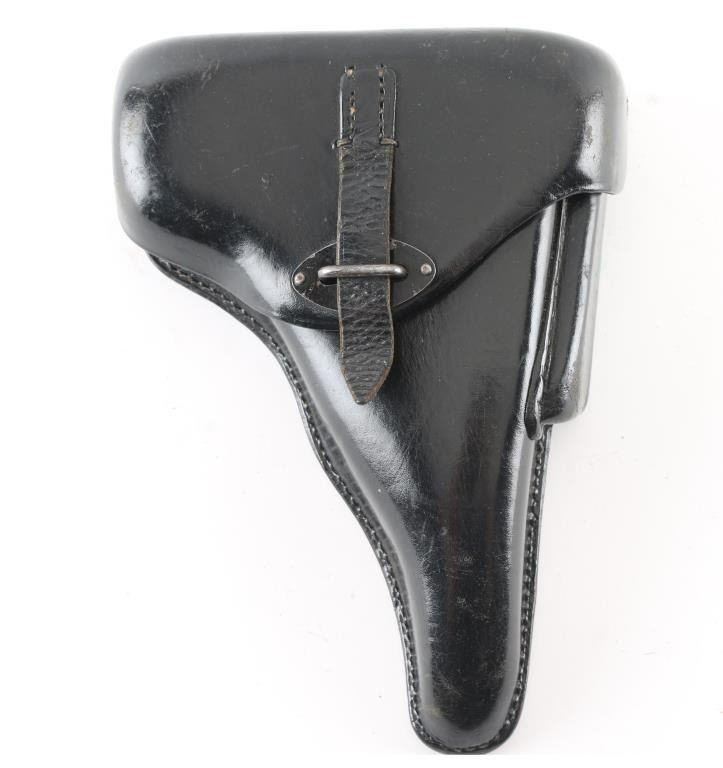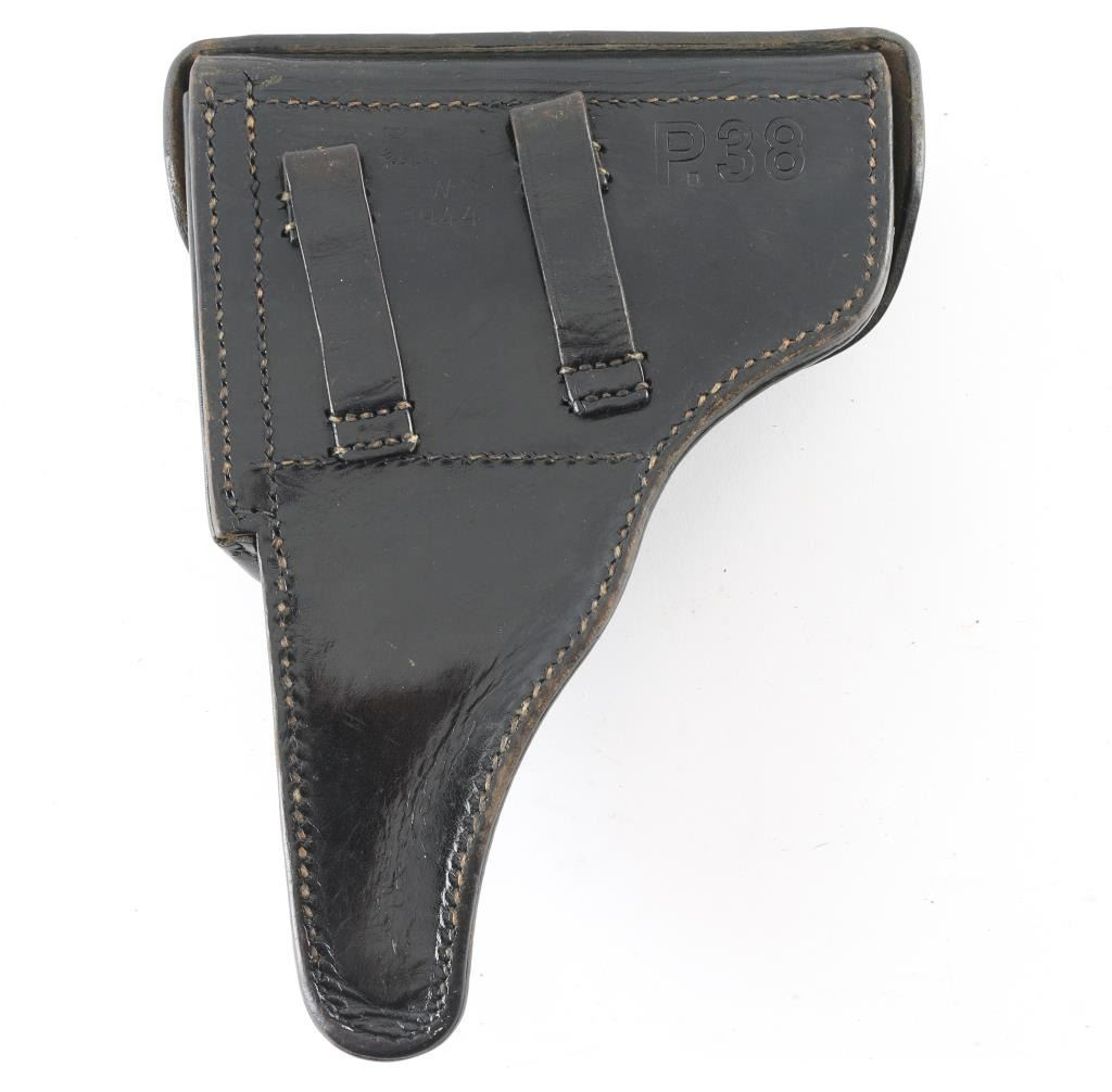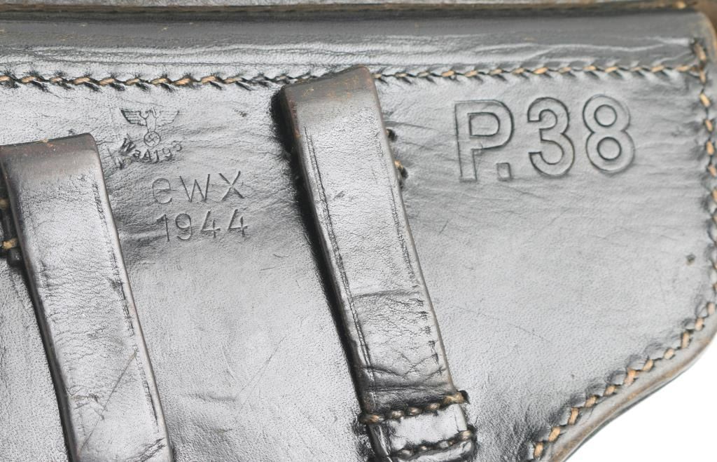 Third Reich era German Military holster for the P-38 Pistol. Hard shell. Black leather construction. Large "P.38" stamped on back, along with makers code "ewx" dated 1944, Waffenamt Eagle/WaW196. Intact, very good condition.