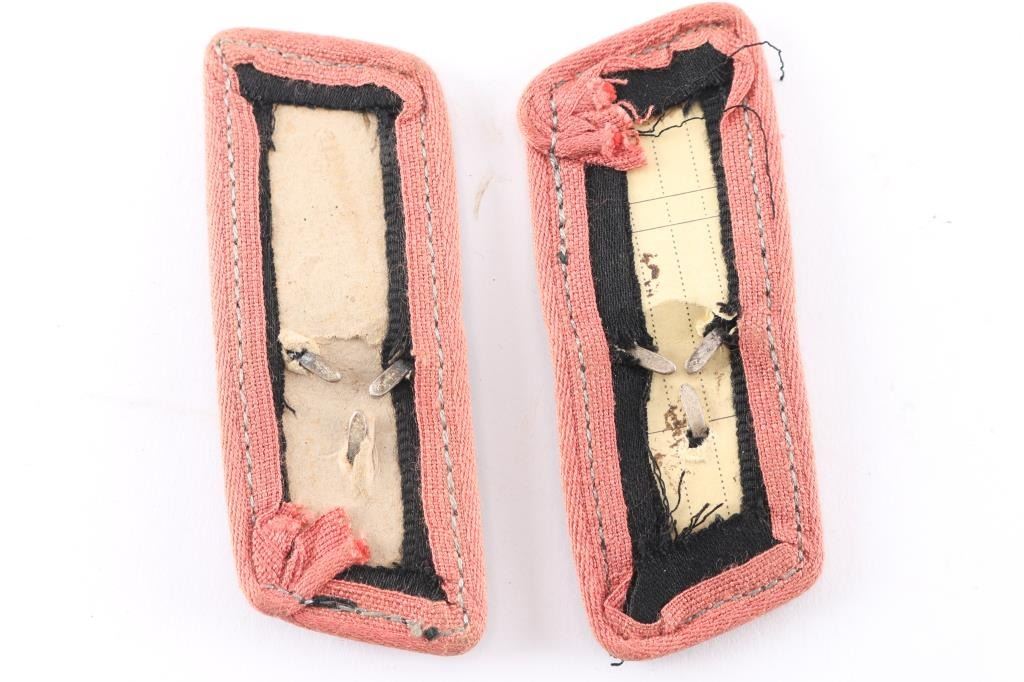 EM Heer Assault Gun collar tabs. Matched pair. Black woolen construction with machine sewn pink panzer piping, 3 prong late war, type 7 Totenkopfs attached. Specifically used by the Sturmgeschütz (Stug) units, which were part of the Panzer division. Construction, design and materials are all correct. Show age and wear. The Buckram backings are missing exposing the correct cardboard interior. Believe original, please look carefully at photos.