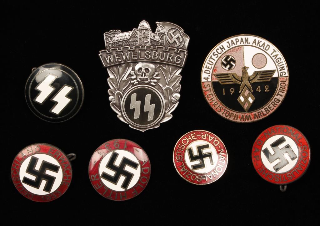 Badges. (1) Waffen SS Silver Runic Badge. The reverse is maker marked 'Richard Sieper & Sohne Ludenscheid RZM M1/24'. Has a wide vertical pin back. Three piece silver plated construction with two black enameled runics on the center. (7) Party Badges. Includes: Waffen SS; NSDAP; Adolf Hitler 1933; Deutschland Erwache 1933; NSDAP; SS Wewelburg; 1942 German & Japanese Alliance. Most are maker marked and have a pin back. Nickel and enamel construction. Offered "as is", we don't guarantee the authenticity of this item, please do your research. All sales are final.