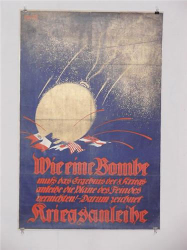 German WWI Poster, "Wieeine Bombe etc.", Artist-Uzarski-1918, Printer-Unclear, 39 ½" x 25 ¾", Condition: Good/Fair - Folding Creases w/ Splits, Small Border Tears, Corner Creasing; Linen Backed,
