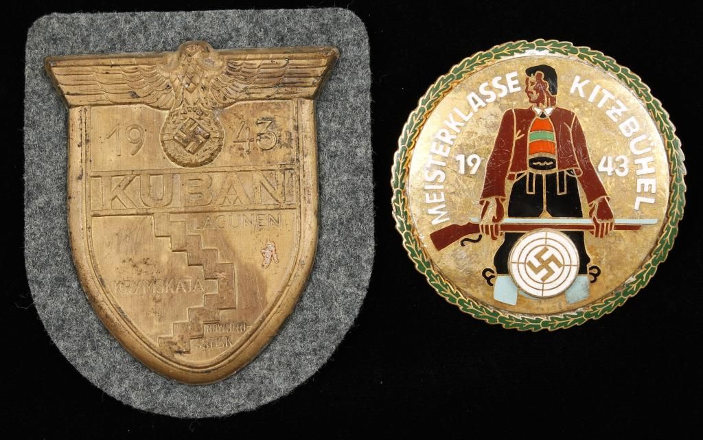 (1)Luftwaffe KUBAN Sleeve Shield. Has a grey wool backing with tan paper on the reverse side. Stamped brass construction. (1) Kitzbuhel Shooting Association Badge. Measures 2 1/8" in diameter. Maker marked 'Ges Gesch' . Has a thin horizontal pin back. Three piece brass construction with enamel. Offered "as is", we don't guarantee the authenticity of this item, please do your research. All sales are final.