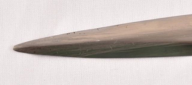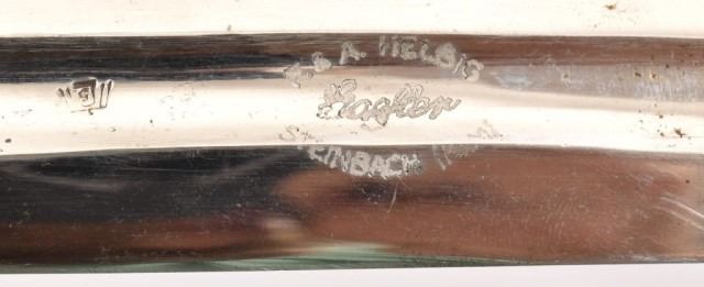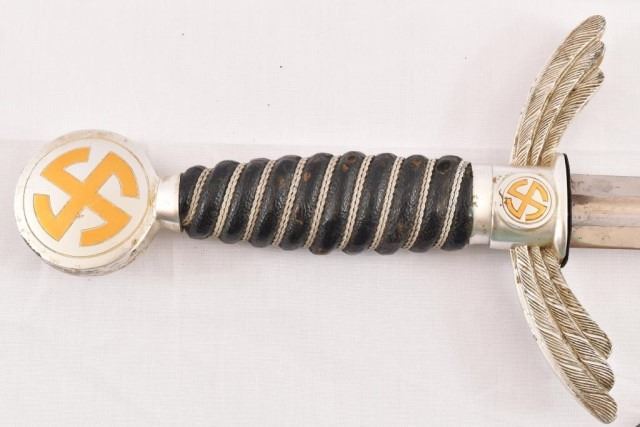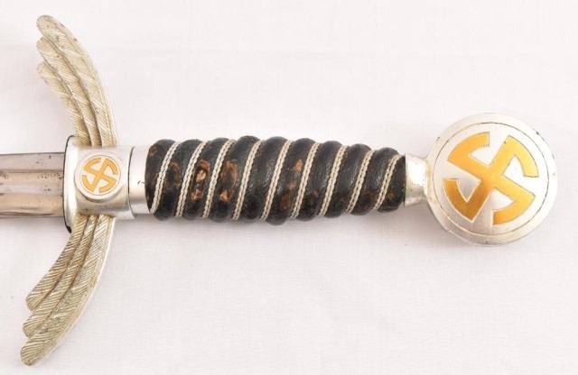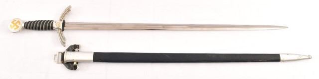 German WWII 2nd Model Luftwaffe Sword. Ricasso is marked “F&A Helsig”. Blade is excellent and is in full polish, except for the light marks from being in and out of the scabbard. Blade has the Luftwaffe acceptance mark. Scabbard leather is very good with minor handling marks. The hanger is intact. 26.5" blade, 35" overall.