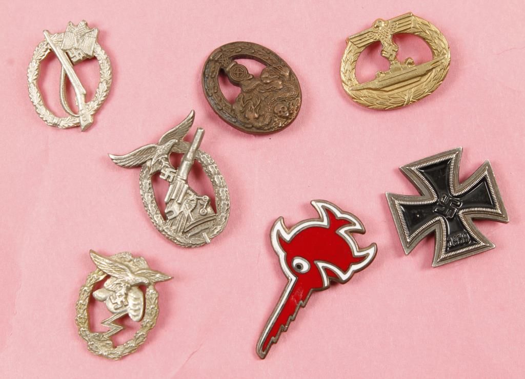 Includes: Luftwaffe Flak Artillery Badge; Army Silver Anti Partisan Badge; Naval U-Boat Submarine Badge; Army Silver Infantry Assault Badge; Luftwaffe Ground Combat Badge; Naval U-Boat Flotilla Sword Fish Enameled Badge; German WWII 1st Class Iron Cross.