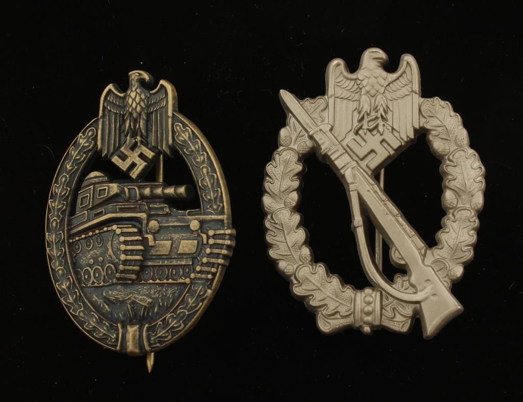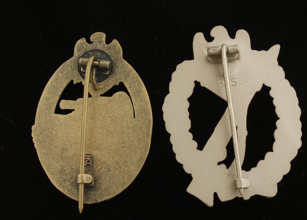 Pin back. Maker marked "HA" (Hermann Aurich). Also includes an Army Silver Infantry Assault Badge. Pin back. Maker marked "RS". Both awarded for three encounters with the enemy.