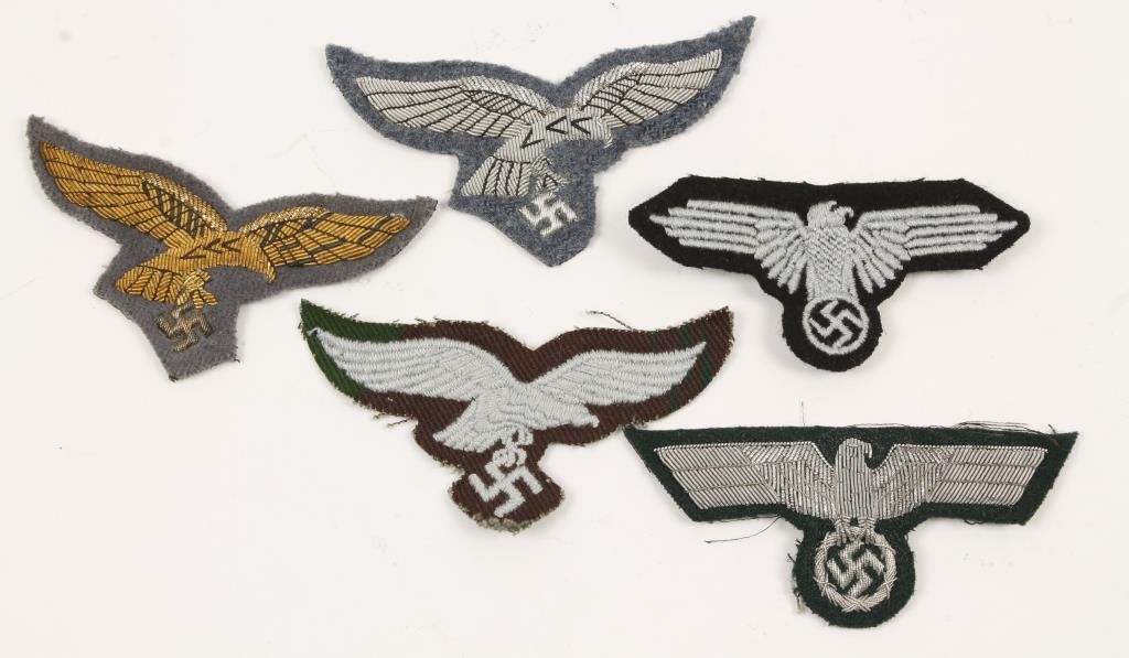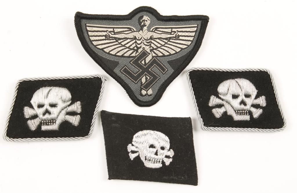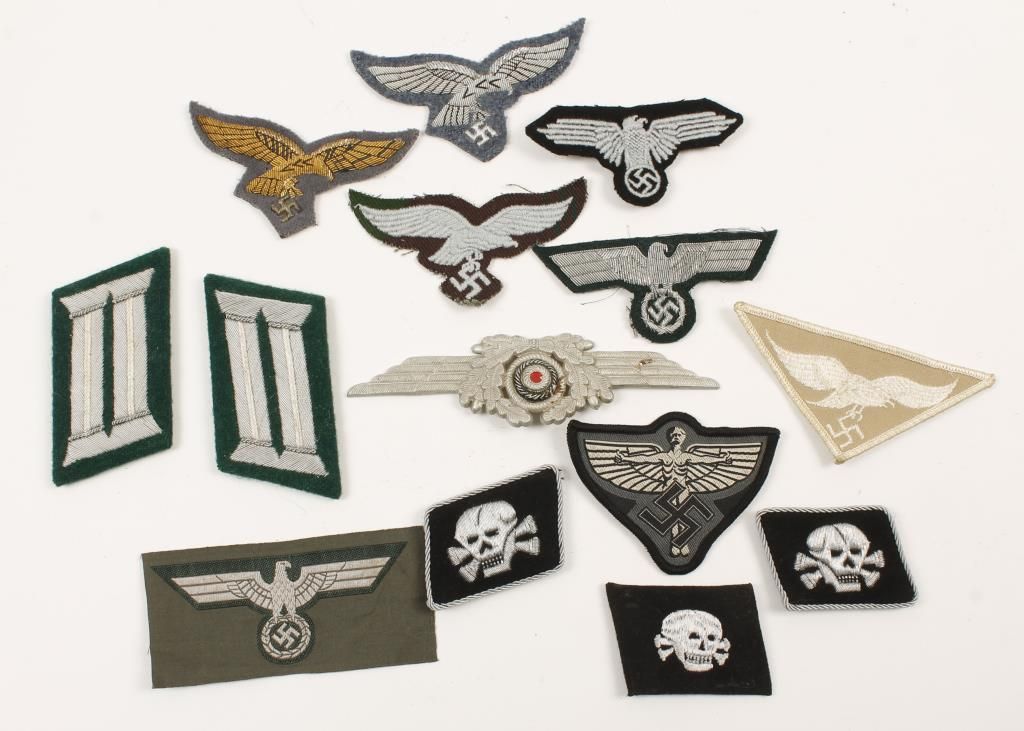 Includes bullion Officer Breast Eagles, SS Skull Collar Tabs, SS EM Arm Eagle, Army Officer Collar Tabs, NSFK Breast Eagle, Luftwaffe Paratrooper Smock Breast Eagle.