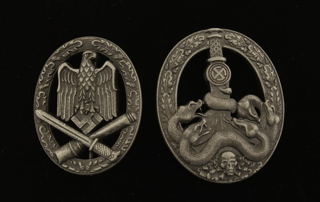 Pin back. Maker marked "JFS" Also included is an Army Silver Anti Partisan Badge. Has a wide vertical pin back.