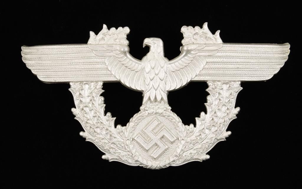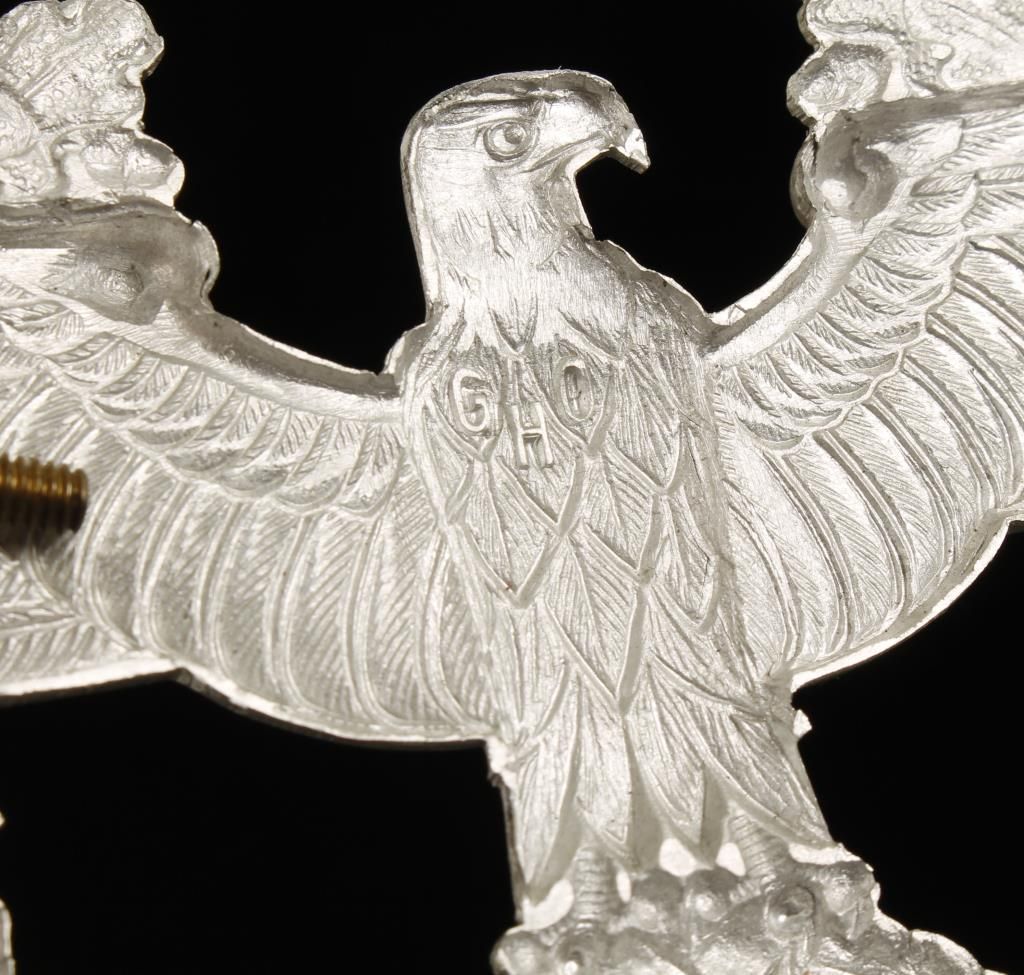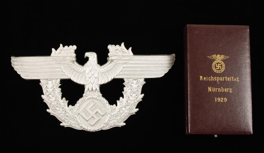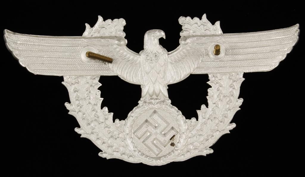 Case Only for a 1929 Nurnberg Table Decoration. Measures 2 5/8" wide by 4" long by 15/16" deep. The outer case is a maroon leatherette construction. Police Enlisted Mans Shako Helmet Eagle. Measures 3 3/16" tall by 6" wide. The reverse side is maker marked 'GHO'. Has two brass threaded posts on the reverse side, one of which is bent. Aluminum construction. Offered "as is", we don't guarantee the authenticity of this item, please do your research. All sales are final.