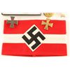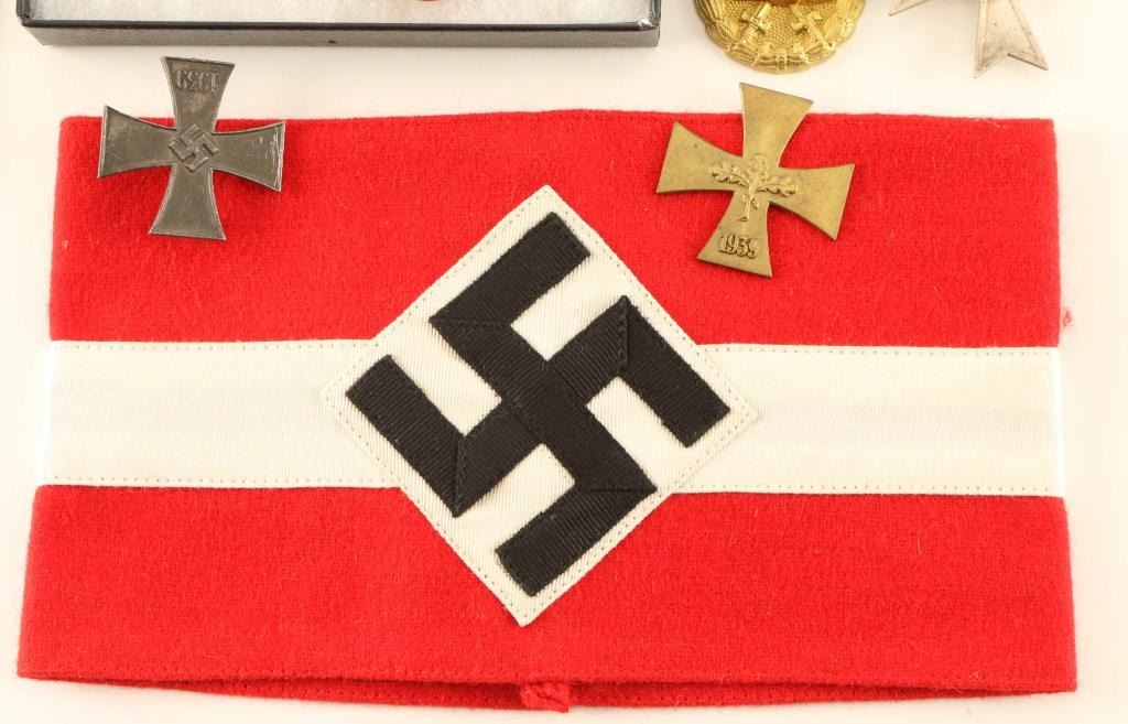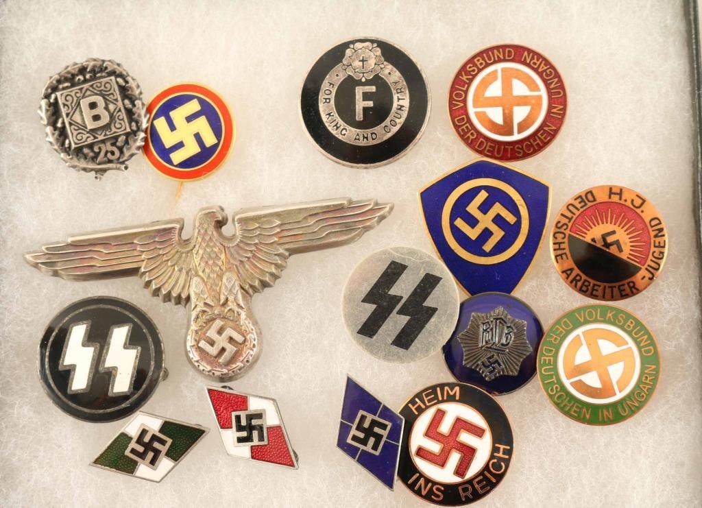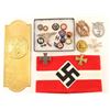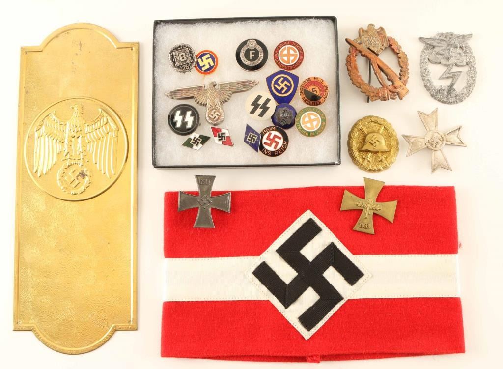 (1) 21 qty German WWII Medals/ Badges and Swastika lapel pins (1) Hitler youth HJ swastika arm band. (1) Reichstag brass door plaque with German eagle in center. Since we are not experts in this field we do not guarantee the authenticity of any of these items.