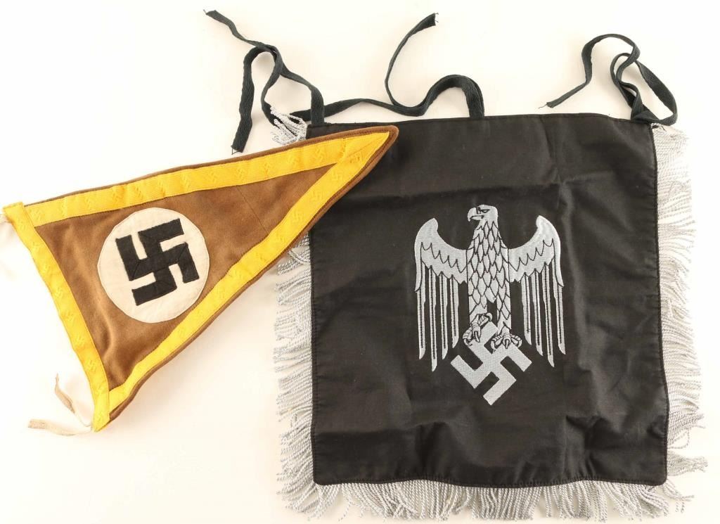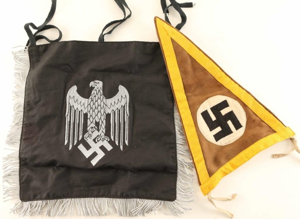 Includes (1) German WWII era Political Leaders Swastika Staff Car Pennant, measures 12 1/2" by 8". and (1) German WWII era Army Heer Eagle Trumpet Banner, measures 14 3/4" 13 1/2". Items are as is and we do not guarantee the authenticity or age.