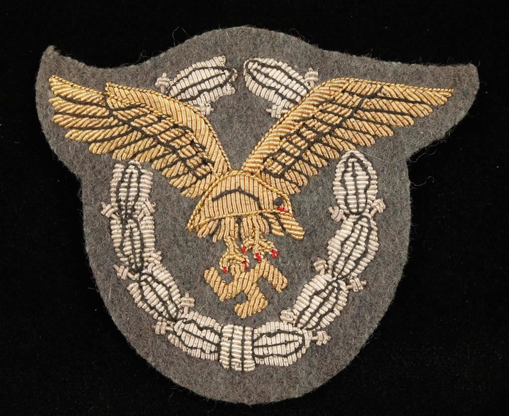 Silver and gold bullion wire embroidered on a grey wool backing. Offered "as is", we don't guarantee the authenticity of this item, please do your research. All sales are final.