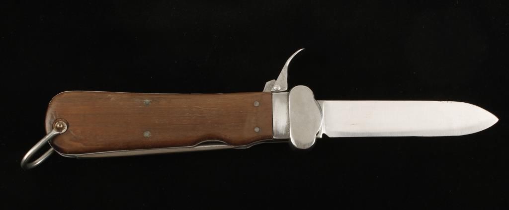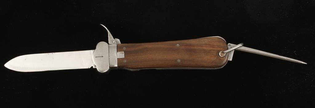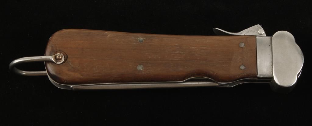 Paratrooper Fallschirmjager. Measures 10-1/6" long overall with the blade open. This is the 2nd model take down version. The spike is stamped with the Luftwaffe issue mark and stamped "RB 0/0561/0019". Has a pair of very fine wood grips that are riveted on. Overall excellent condition.