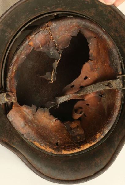 Most of the original paint, decal is 80-90% intact. Leather liner in poor condition and also leather chin strap present but broken and in poor condition.