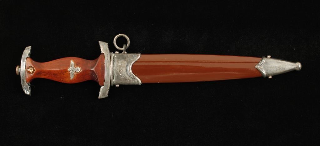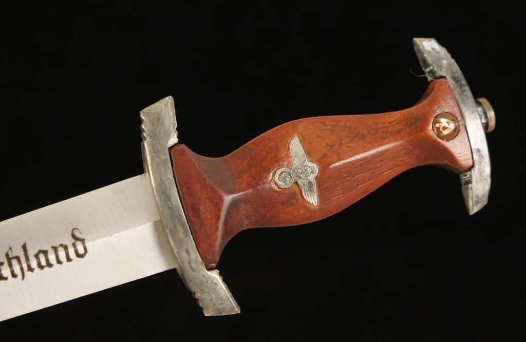 Miniature SA Sturm Abteilung Dagger & Scabbard. Measures 7 5/16" long overall. The etched steel blade reads 'Alles fur Deurschland' (Everything for Germany). It measures 5/*" wide by 4 1/4" long. Includes the brown painted steel scabbard that measures 3/4" wide by 4 7/8" long. All of the fittings are nickel construction. This was used as a salesman's sample. Offered "as is", we don't guarantee the authenticity of this item, please do your research. All sales are final.