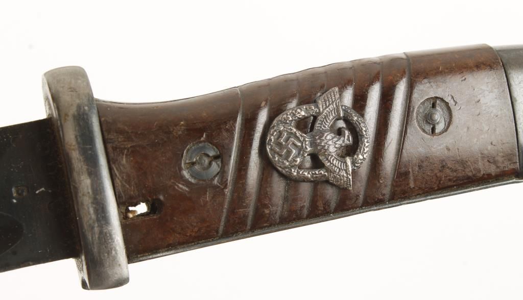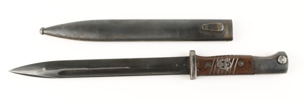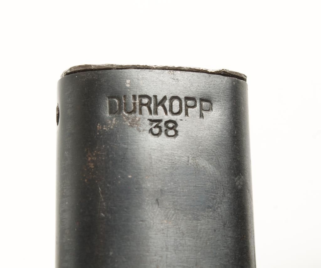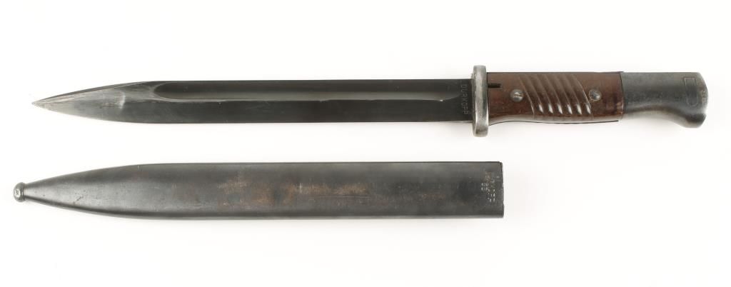 With scabbard. Measures 15-7/8" overall. The steel blade is maker marked "Durkopp". The bayonet and scabbard are both stamped "5970" with matching numbers. Ha a police emblem mounted on the front of the bake lite handle.