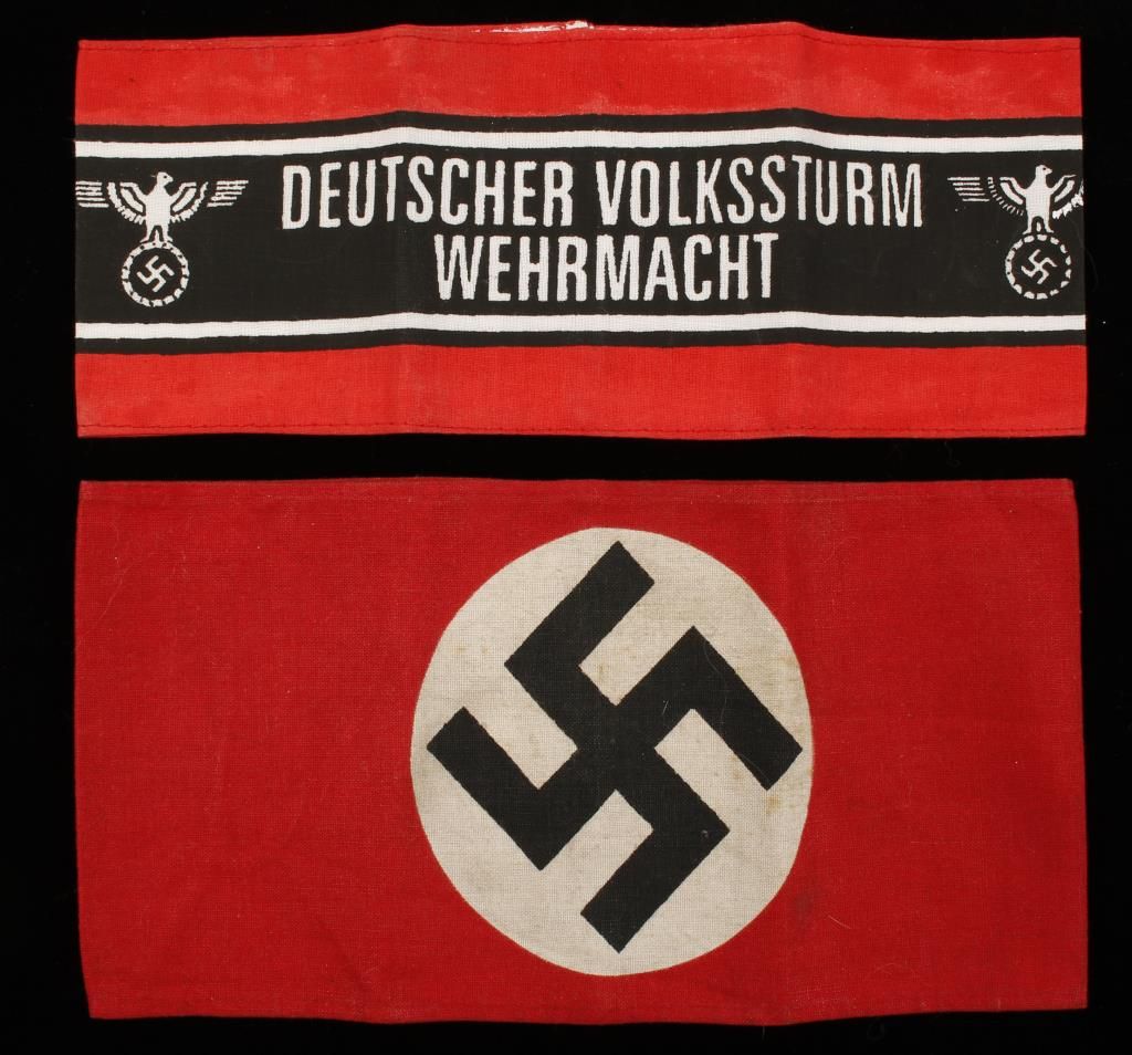 Breast Eagles. Arm band measures 4 3/8" tall by 8 3/8" wide. Included is a Deutscher Volksturm Wehrmacht Arm Band. Measures 3 3/8" tall by 8 1/12" wide. Both are printed construction. Eagles are uncut from a roll. Bevo construction. Also included are three foreign volunteer sleeve shields. Embroidered cotton construction. Offered "as is", we don't guarantee the authenticity of this item, please do your research. All sales are final.