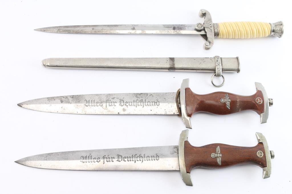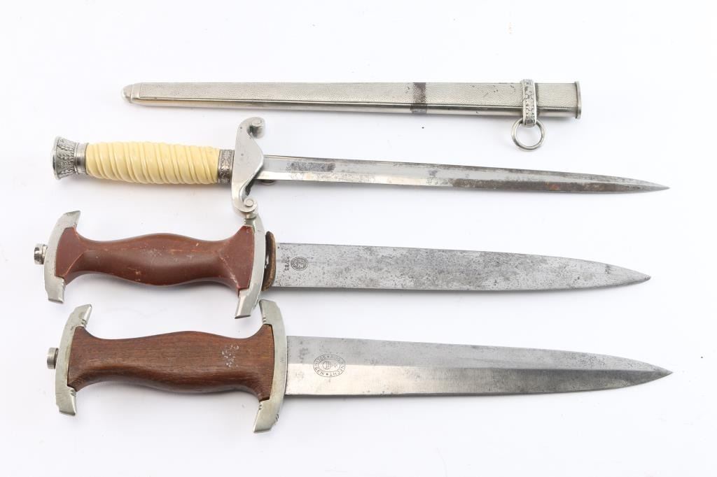 Includes: 2 - daggers w/o sheaths, one marked, "AUG.KNECHT SOLIGEN w/wooden handle and the other marked, "RMZ M7/85 w/plastic handle; 1 - unmarked officer's dagger w/metal sheath. Fair to good condition.
