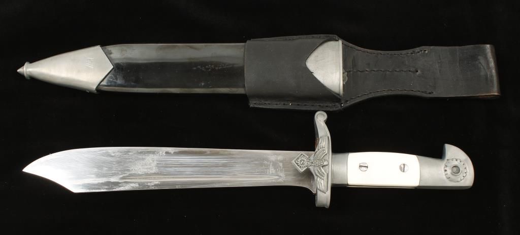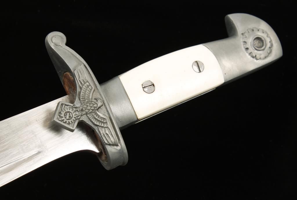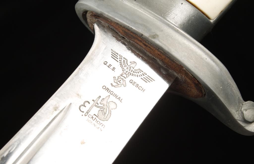 Measures 15-7/8" long overall. The steel blade is maker marked. 'Ges Gesch Original Eickhorn Solingen'. Has the squirrel logo in the center with the Teno eagle above. The blued steel scabbard measures 1-7/8" wide by 10-7/8" long. Includes the black leather belt frog. The handle has a pair of white celluloid handles. The fittings are nickel construction. This organization was the Technical Emergency Corps and is for an enlisted man.