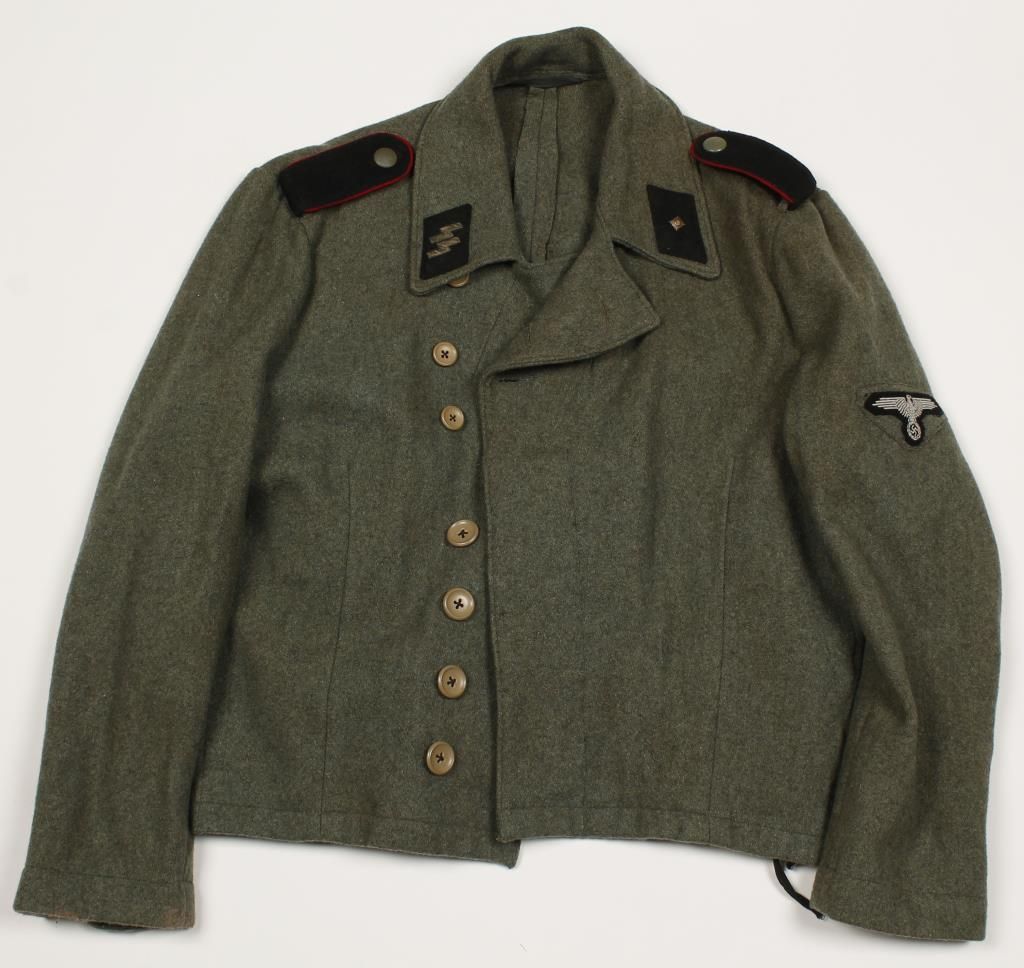 Wrapper Tunic. Has a pair of SS enlisted mans collar tab on the collar. There is an SS arm eagle machine sewn on the upper left sleeve. Has a pair of slip on artillery shoulder boards. The body is wool construction. A medium size. RARE.
