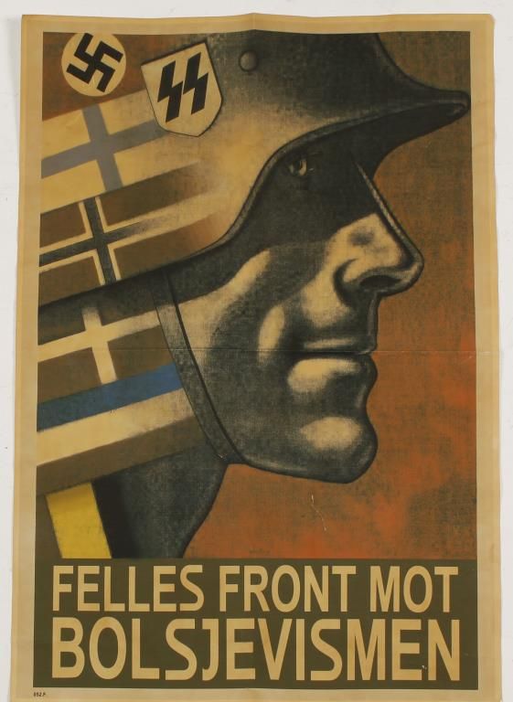 Measures 22-3/4" wide x 32-3/4" tall. The front shows a helmeted SS Soldier. Below reads "Felles Front Mot Bolsjevismen" Printed paper construction.