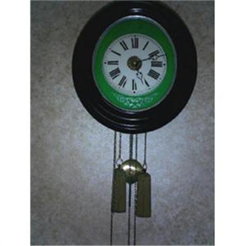 German wall clock with time, strike, and alarm. This clock has been cleaned and operates perfectly. The works are typical for the circa, 1830s, 1850s. 30 hour wall clock having the Oak plates separating for time and strike gear trains. The gears and arbors are brass and steel. The face is reverse painted glass the frame is wood. The works have wooden doors on each side. The weights are for the alarm (small size) were not on the clock at the time of the picture. This is a small 12"H X 11"W clock very attractive.
