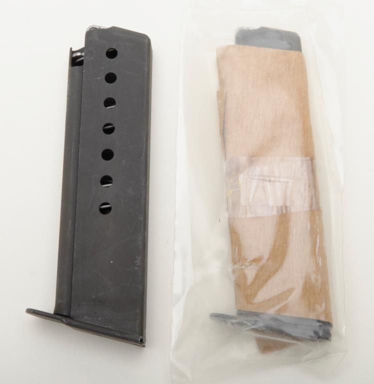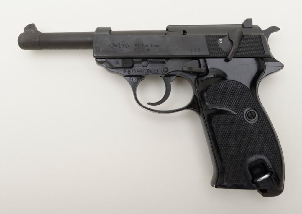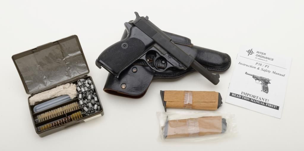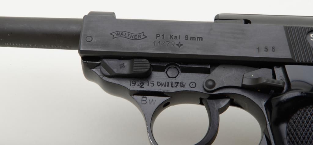 German Walther P-1 DA semi-auto pistol, 9mm cal., 5” barrel, import-marked, re-finished, checked black plastic grips, #192156 with leather flap holster, instructions, extra magazine and cleaning kit. This gun is in overall good condition as re-furbished with a very good bore, action, markings and grips; good holster. (C&R/PPT). Est.: $300-$500.