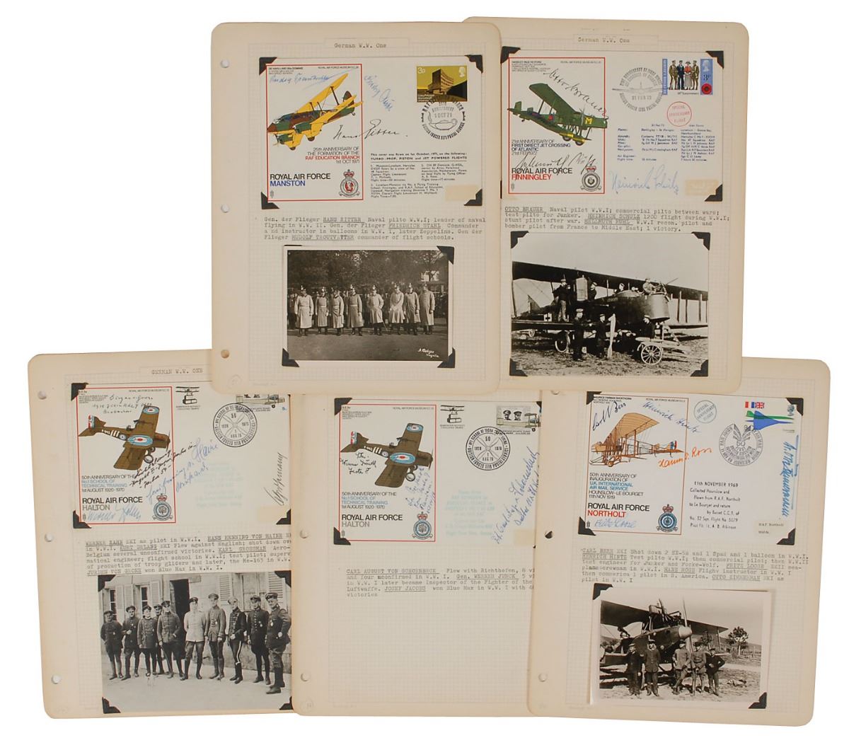 Collection of five commemorative covers honoring the Royal Air Force, each signed by a series of German World War I Pilots, including: Hans Ritter, Friedrich Stahl, and Rudolf Trautvetter; Werner Zahn, Hans Henning von Haine, Kurt Delang, Karl Grossman, and Jurden von Grone; Carl August von Schoenbeck, Werner Junck, and Josef Jacobs; Carl Berr, Henrich Hintz, Fritz Loose, Hans Ross, and Otto Zimmerman; and Otto Brauer, Heinrich Schulz, and Helmuth Ruhl. Corner-mounted to larger scrapbook pages. In fine condition. Accompanied by several unsigned photos.