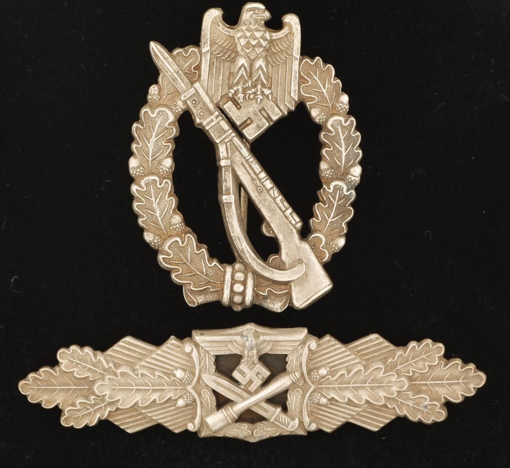 Has a wide fluted horizontal pin back. Maker marked 'Fec W E Peekhaus Berlin Ausf AGMuK Gablonz' Also included is an Army Silver Infantry Assault Badge. Has a thin vertical pin back. The fittings on the reverse are double riveted on. Solid construction.